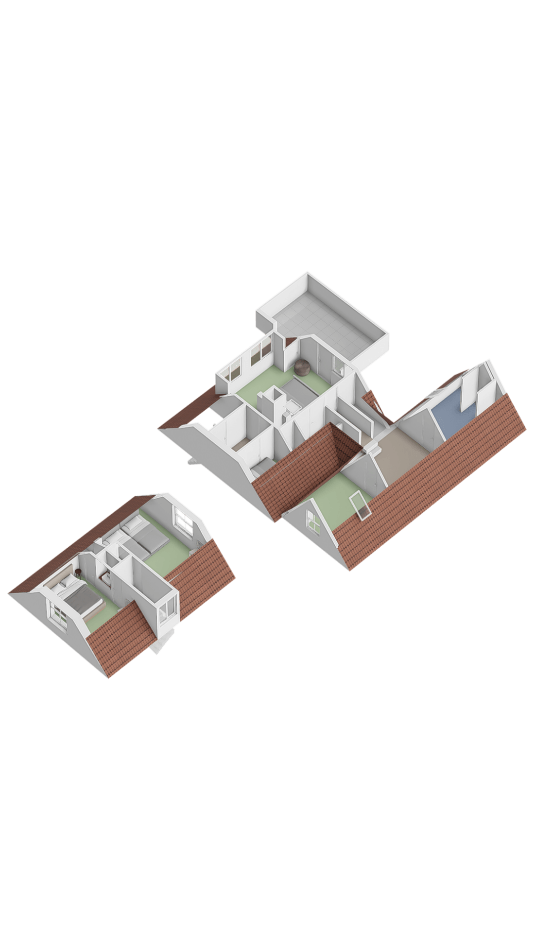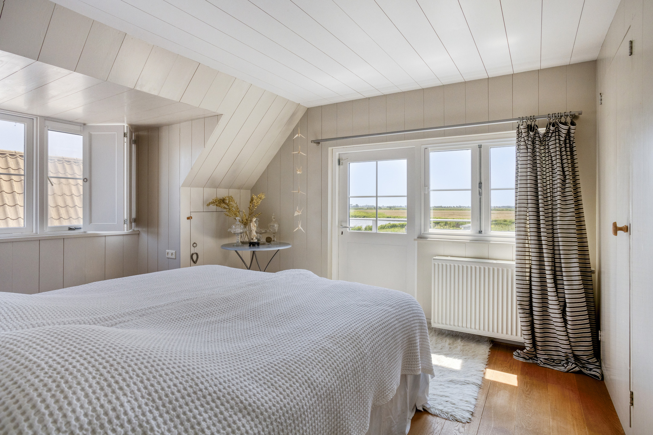 De eerste verdieping is verdeeld over het voorhuis en het achterhuis. In het voorhuis vind u twee ruime slaapkamers, elk voorzien van bergruimte achter de knieschotten. In het achterhuis leidt een brede trap naar een sfeervolle overloop, waar een charmante bedstee is ingebouwd, een unieke toevoeging dat kinderen zeker zal aanspreken. Vanuit hier bereikt u de royale master bedroom, voorzien van ingebouwde kastenwanden, een bergvliering en openslaande deuren naar een ruim dakterras met vrij uitzicht over het omringende landschap.