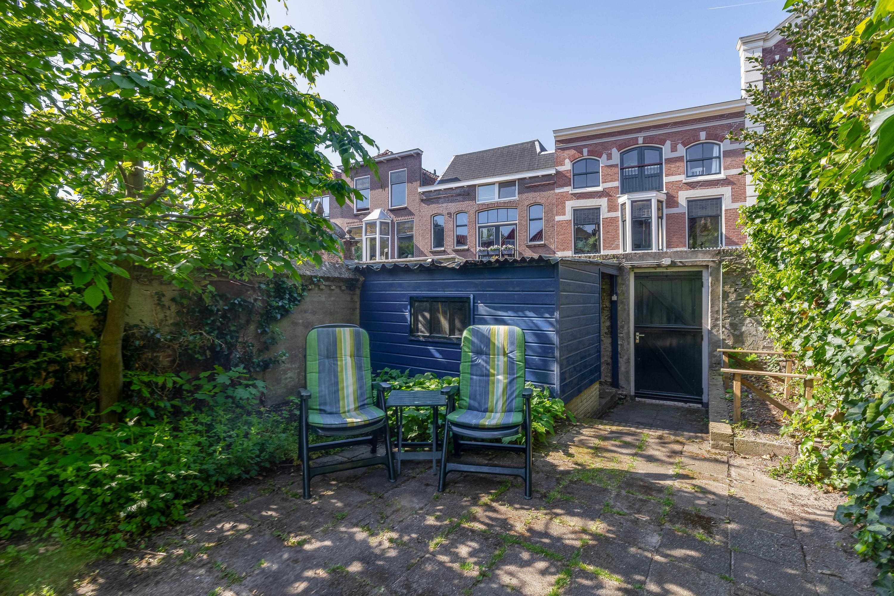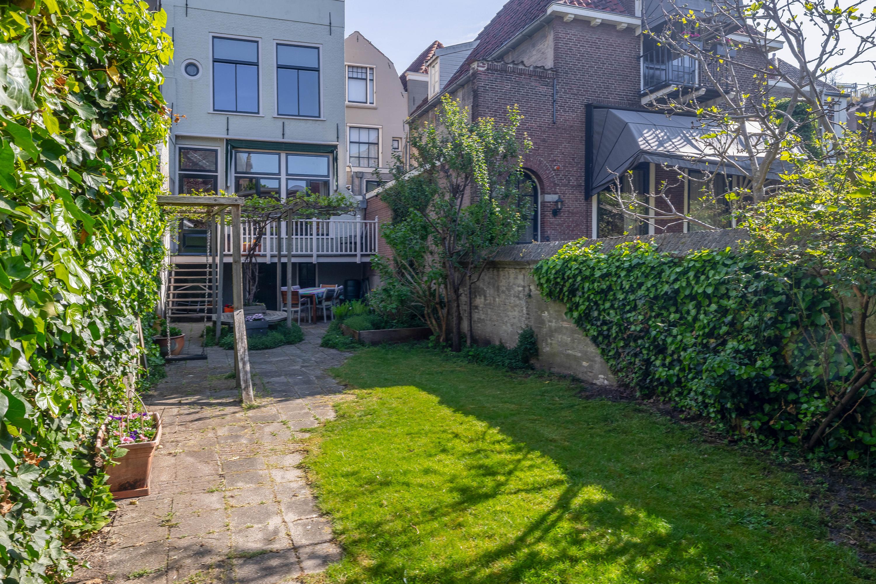 De zonnige en sfeervolle tuin is ruim 25 meter diep en heeft diverse terrassen, toegang tot de kelder, een schuur achter in de tuin, een houten toegangsbrug aan achterzijde vanuit de Peperstraat en een gerenoveerde stadsmuur. Vanuit de tuin, maar ook vanuit het huis heeft u fantastisch uitzicht over monumentaal Gouda.