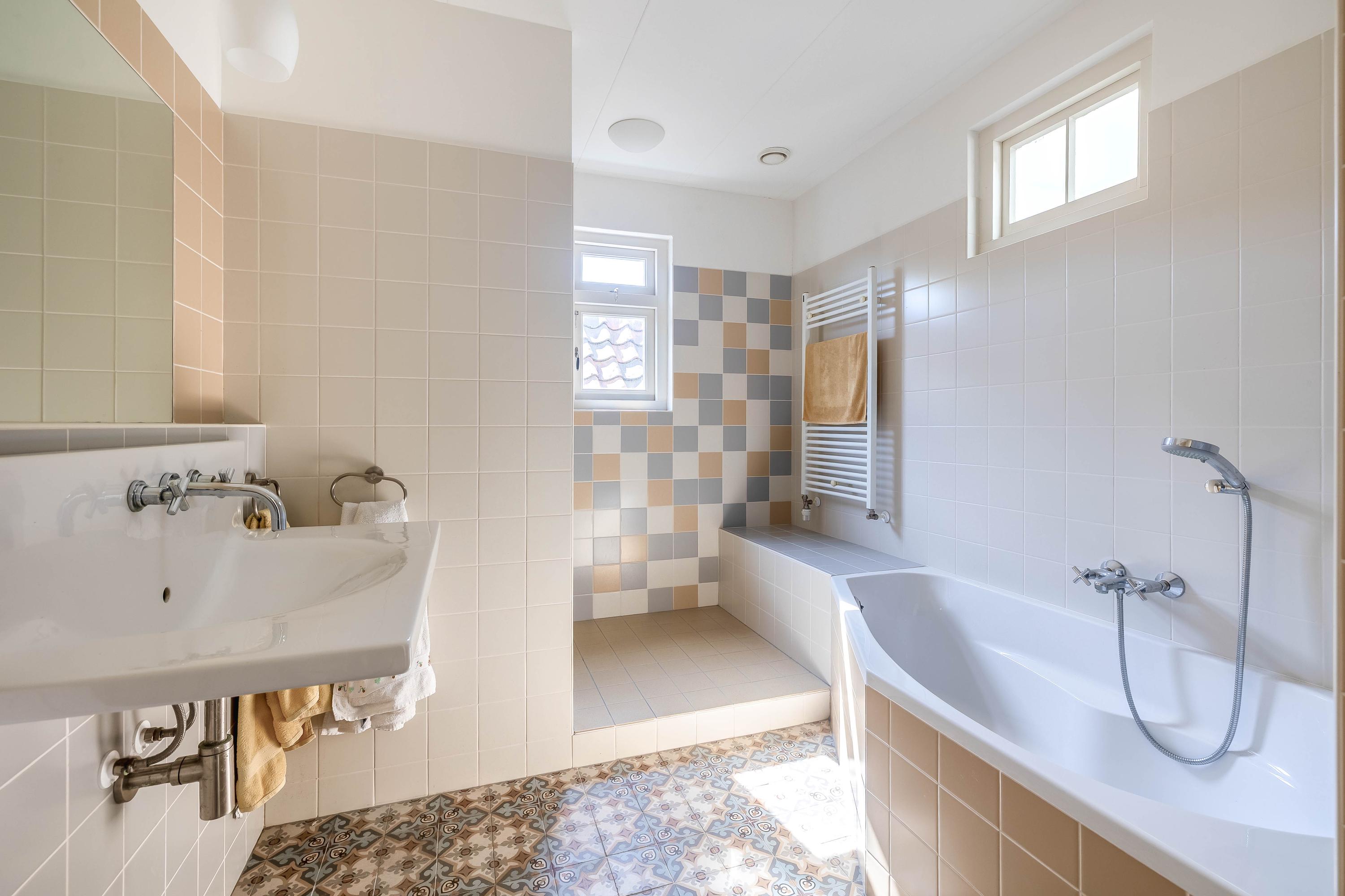 royale overloop met lichtstraat, laminaat, toiletruimte (met zwevend toilet en fonteintje), lichte badkamer met inloopdouche, ligbad, wastafel, ramen, geheel betegeld en designradiator