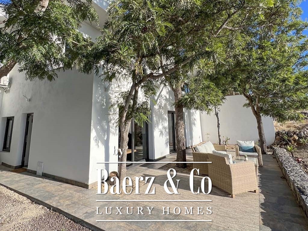 Het hele terrein is weelderig begroeid met bomen, struiken, cactussen en vetplanten. Rondom het huis ligt een met graniet betegeld terras. De slaapkamer, het terras en het perceel bieden een prachtig uitzicht op de oceaan en Gran Canaria.