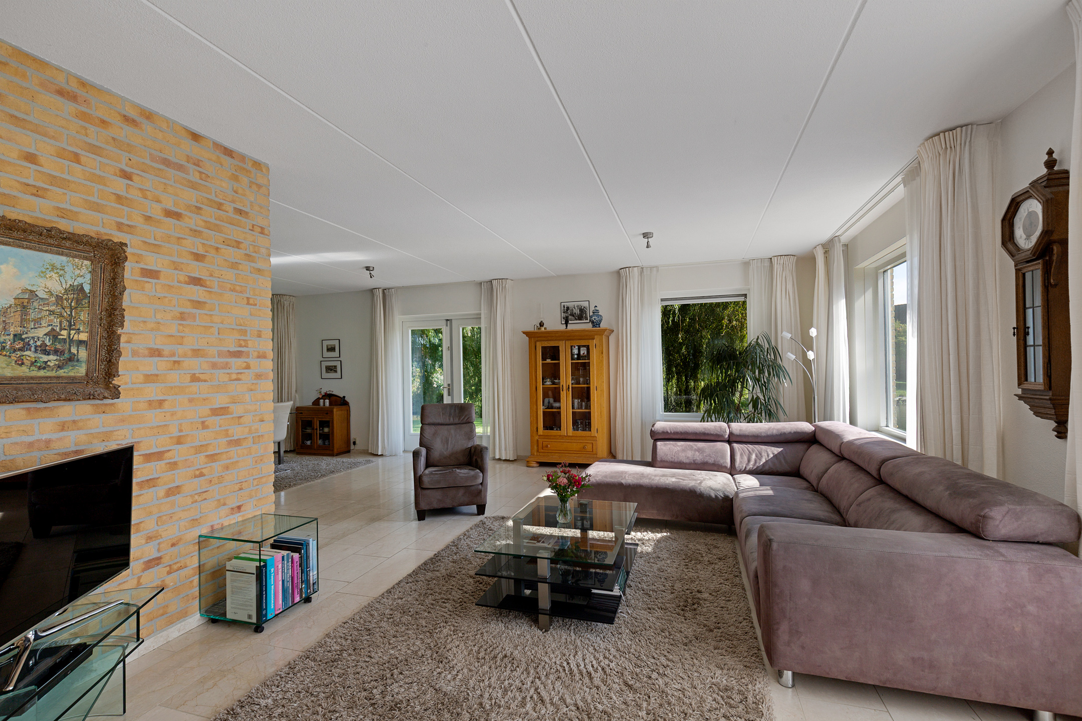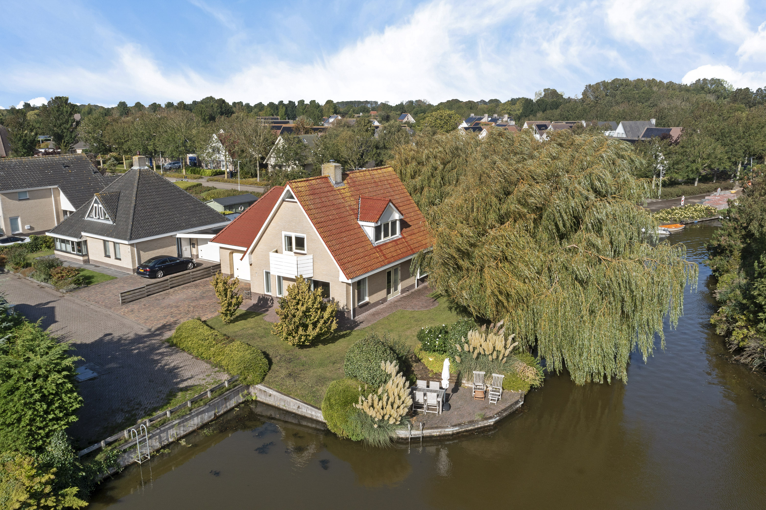 Bij het betreden van de woonkamer valt het zicht op de prachtige waterpartijen aan de groene tuin direct op. Wat een plek! Door de vele ramen aan alle kanten van de woonkamer komt er veel licht binnen. De verzorgde tuin rondom de woning heeft prachtige statige treurwilgen aan de waterkant hetgeen veel privacy biedt. Iets dat benadrukt wordt doordat de woning is gelegen op een hoekperceel aan een doodlopende straat van deze ruim opgezette wijk.