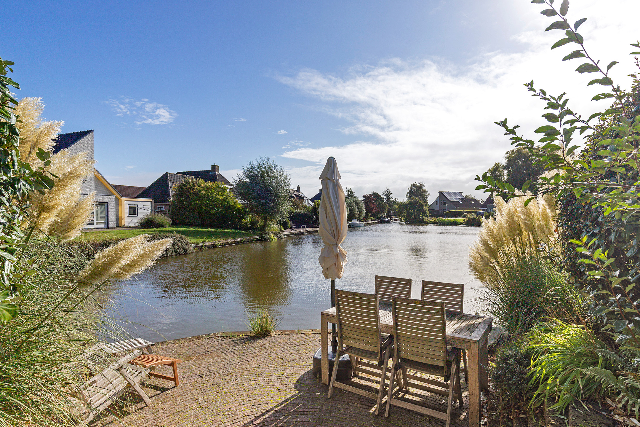De keurig verzorgde tuin met diverse soorten bomen, struiken, borders en bestrating geeft veel beschutting en privacy. Door de ligging is er altijd wel een plekje in de schaduw of zon te vinden. Het zonnige verdiepte en bestrate terras met eigen zwemtrap op het zuidoosten aan het water is een fijne stek waar je al vroeg in de ochtend met een kop koffie de zon vangt en tot aan het einde van de dag heerlijk kunt vertoeven of van het water(sporten) kunt genieten. Het vaarwater is een aftakking van de Bolswardervaart, bekend van de Elfsteden route en is te bevaren met een sloep.