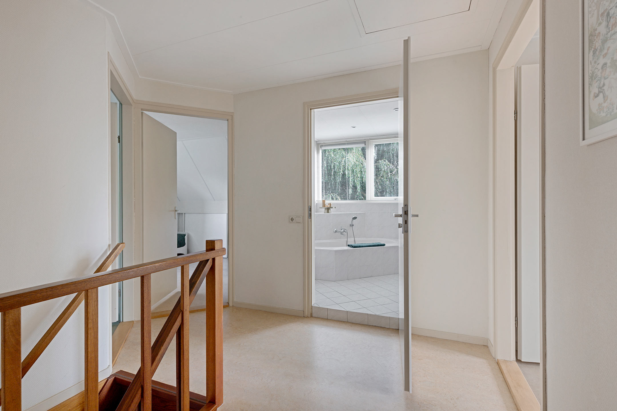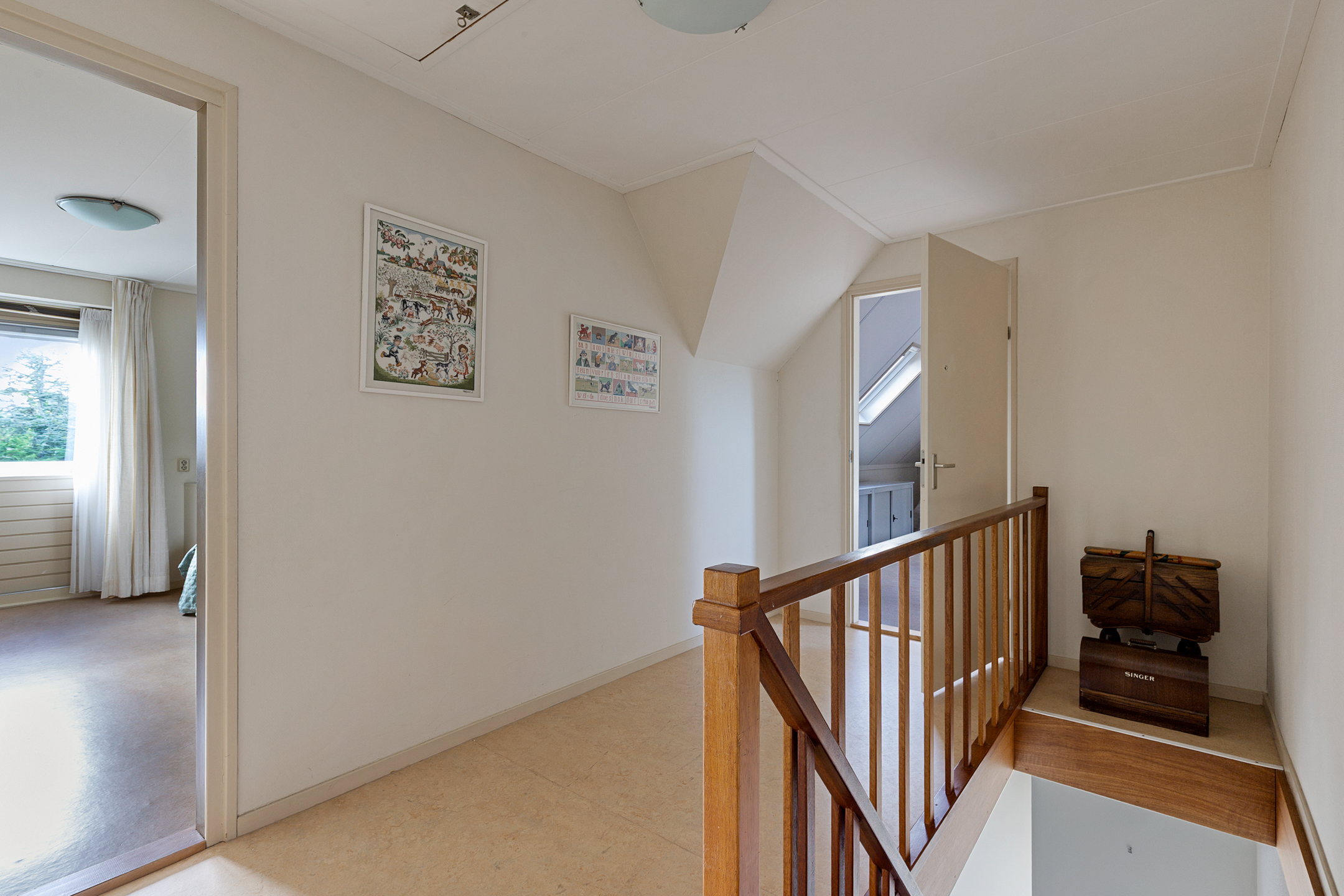 De verdieping is voorzien van een marmoleum vloer en de slaapkamers worden verwarmd met radiatoren.