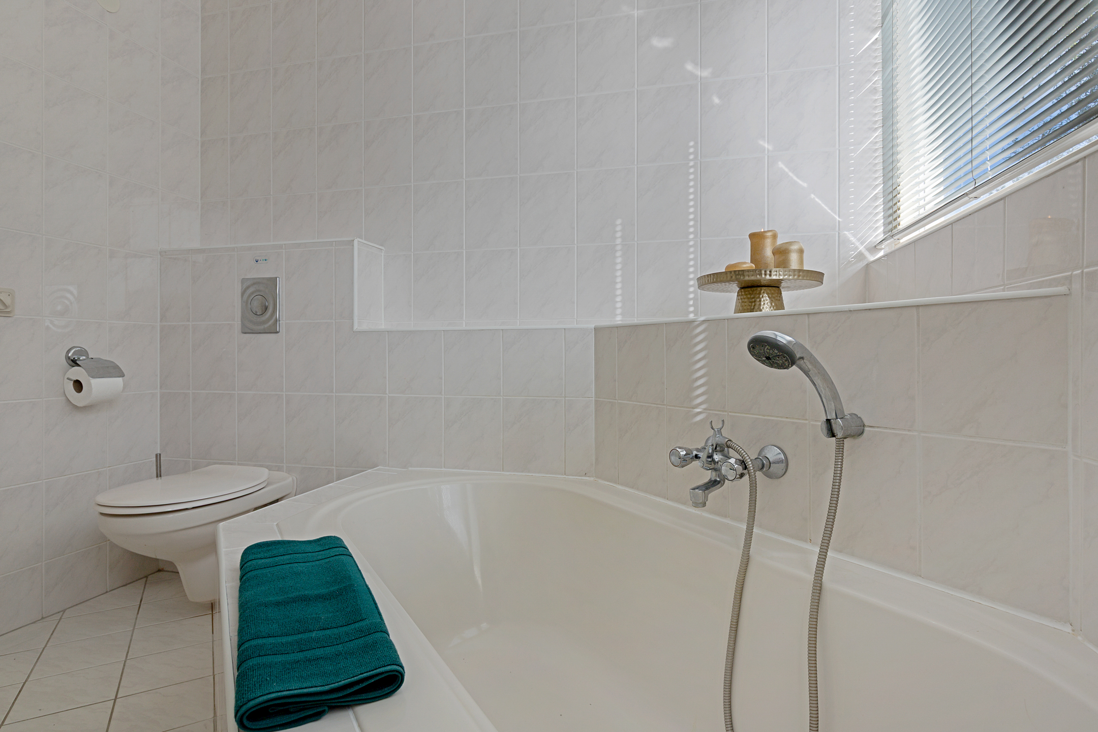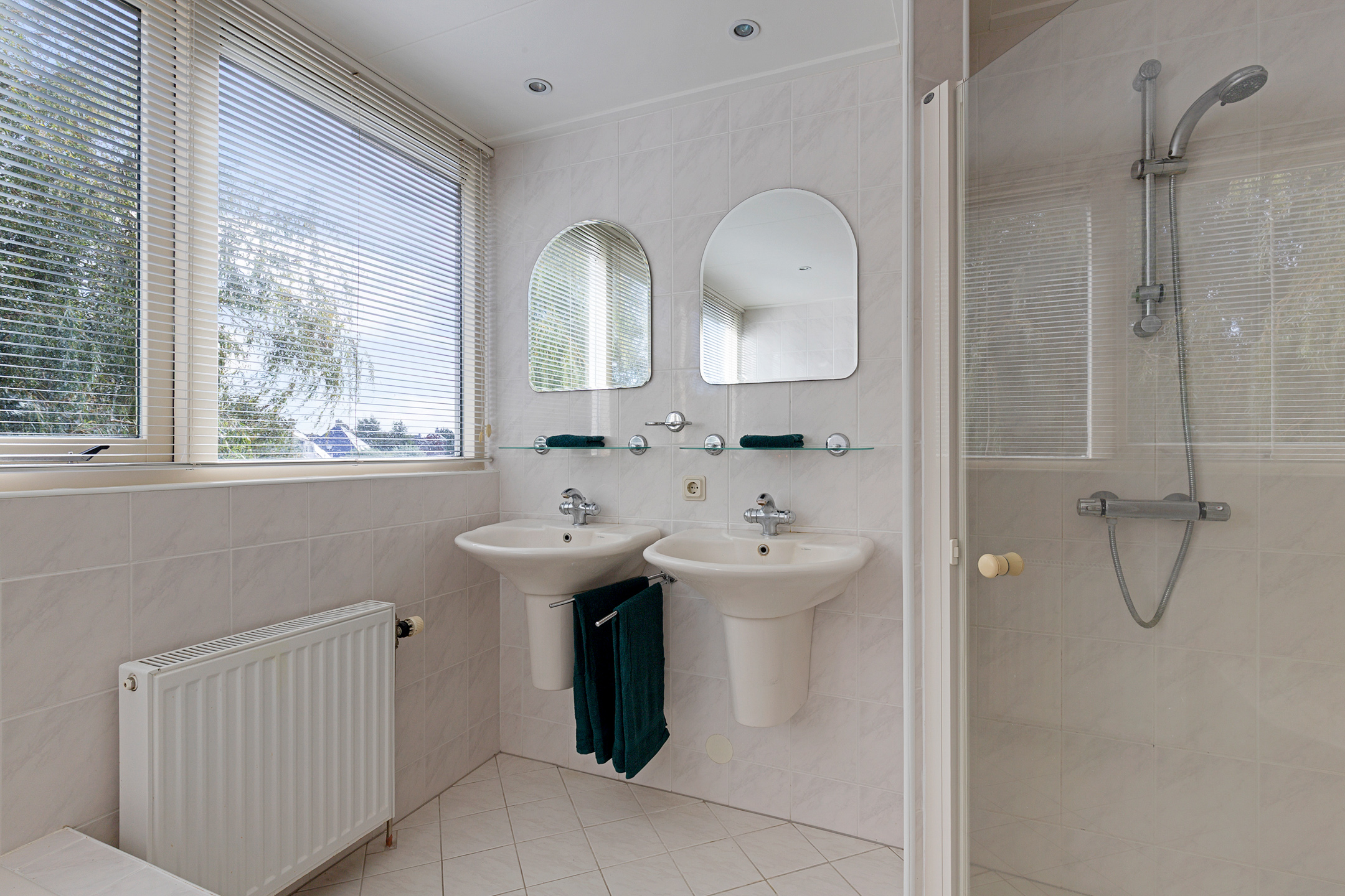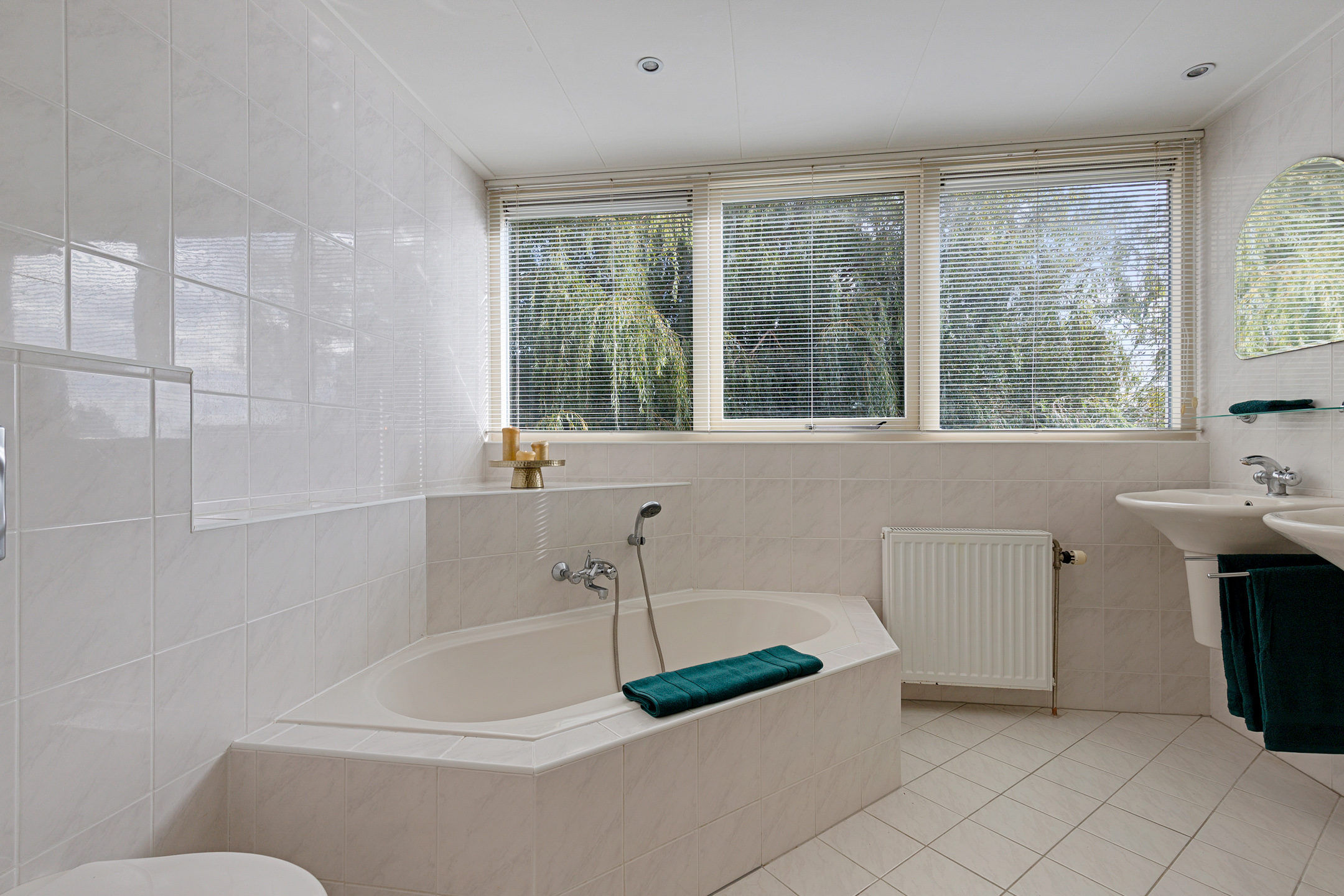 De badkamer in neutrale kleurstelling is ruim van formaat dankzij het grote dakkapel en voorzien van ligbad, een douche, toilet en dubbele wastafels. De grote raampartij biedt prachtig zicht over de tuin en het water.