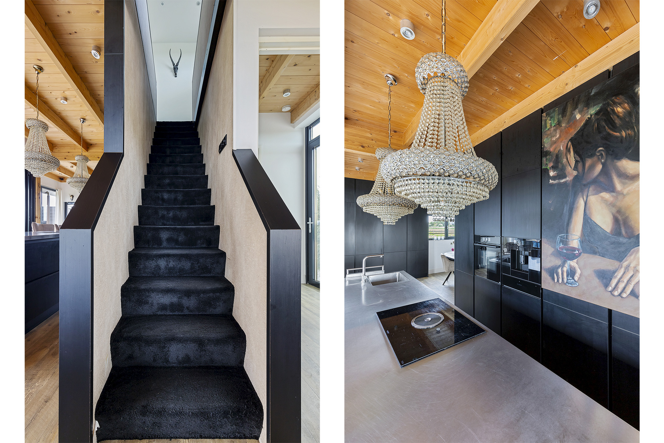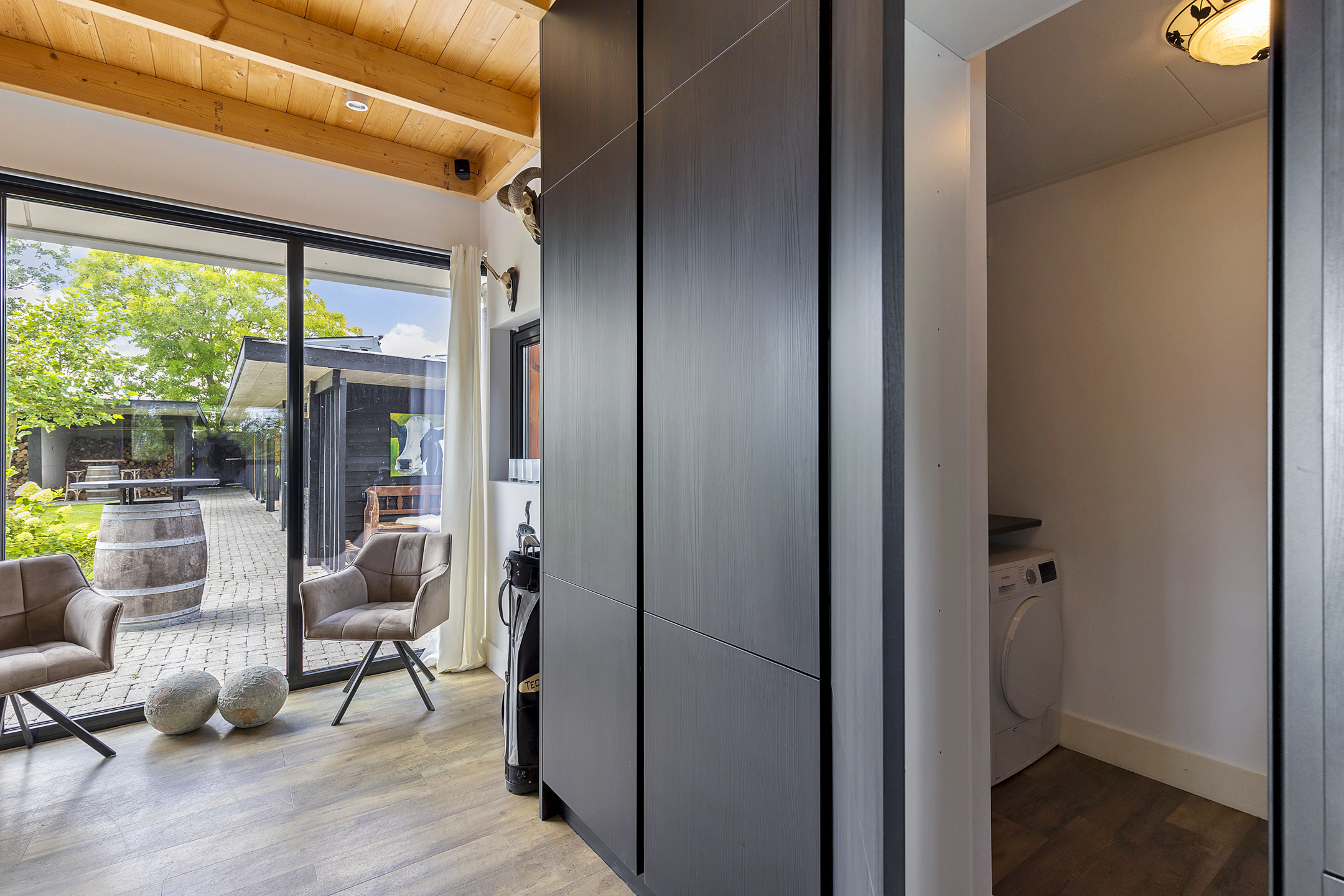 De open leefkeuken is een feest an-sich.. een plek waar tijdens het koken veel wordt geborreld. De open glazen harmonica schuifdeuren aan het inpandig terras staan nagenoeg altijd open dankzij de luwe ligging door de in carré opgestelde bijgebouwen. Zo wordt de tuin volledig bij de binnen leefruimte betrokken. De keuken heeft een met stoer RVS kook-/spoeleiland en is voorzien van alle luxe; een grote inductie kookplaat met geïntegreerde afzuiging, een extra grote spoelbak met kokend waterkraan, en de strakke zwarte kamerhoge kastenwand heeft een geïntegreerde koffiemachine en combi-oven. De bijkeuken, voorzien van de witgoedaansluiting, is smaakvol verborgen in de uitbouw achter een kastenwand in dezelfde stijl als de keuken.