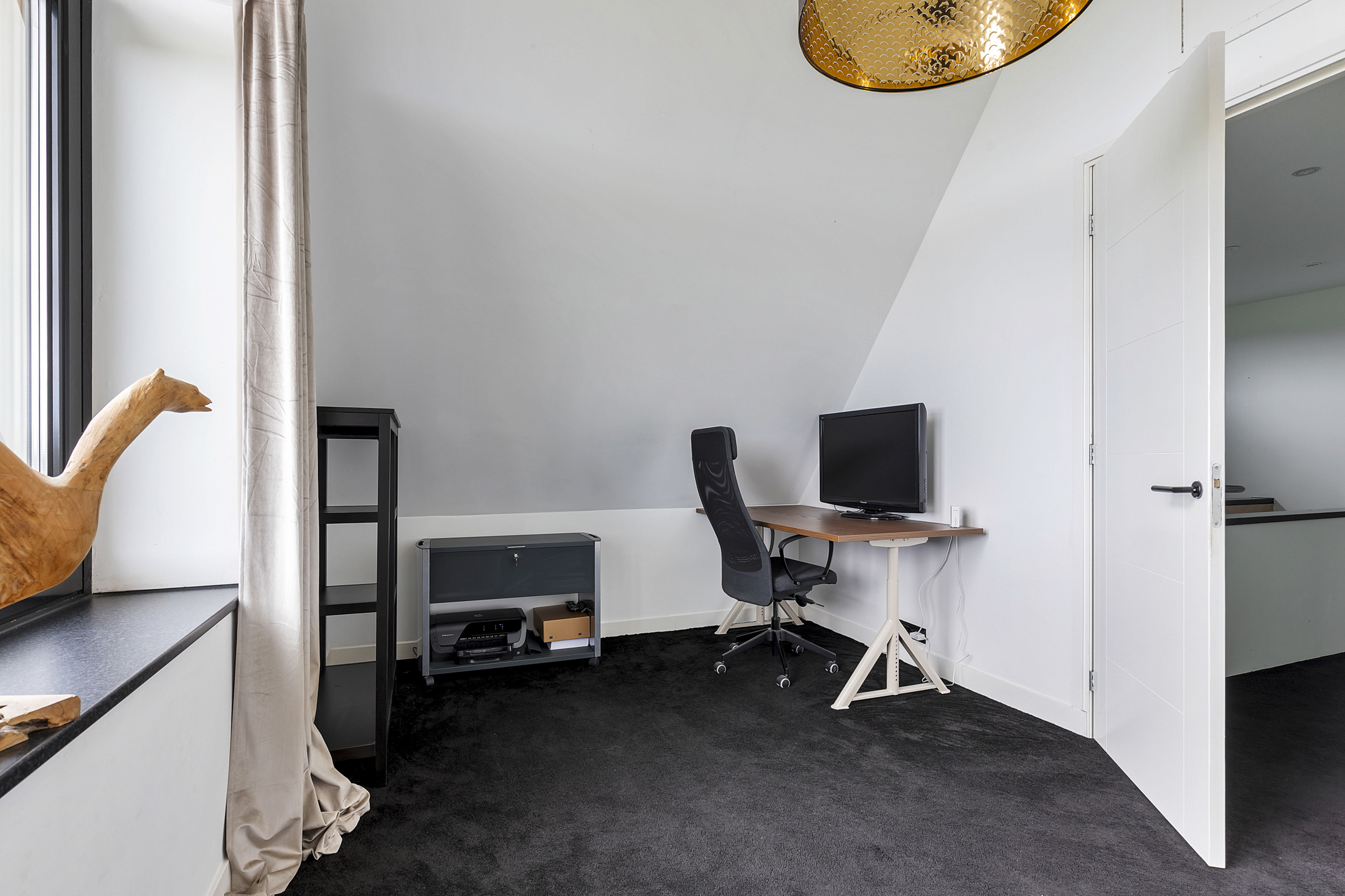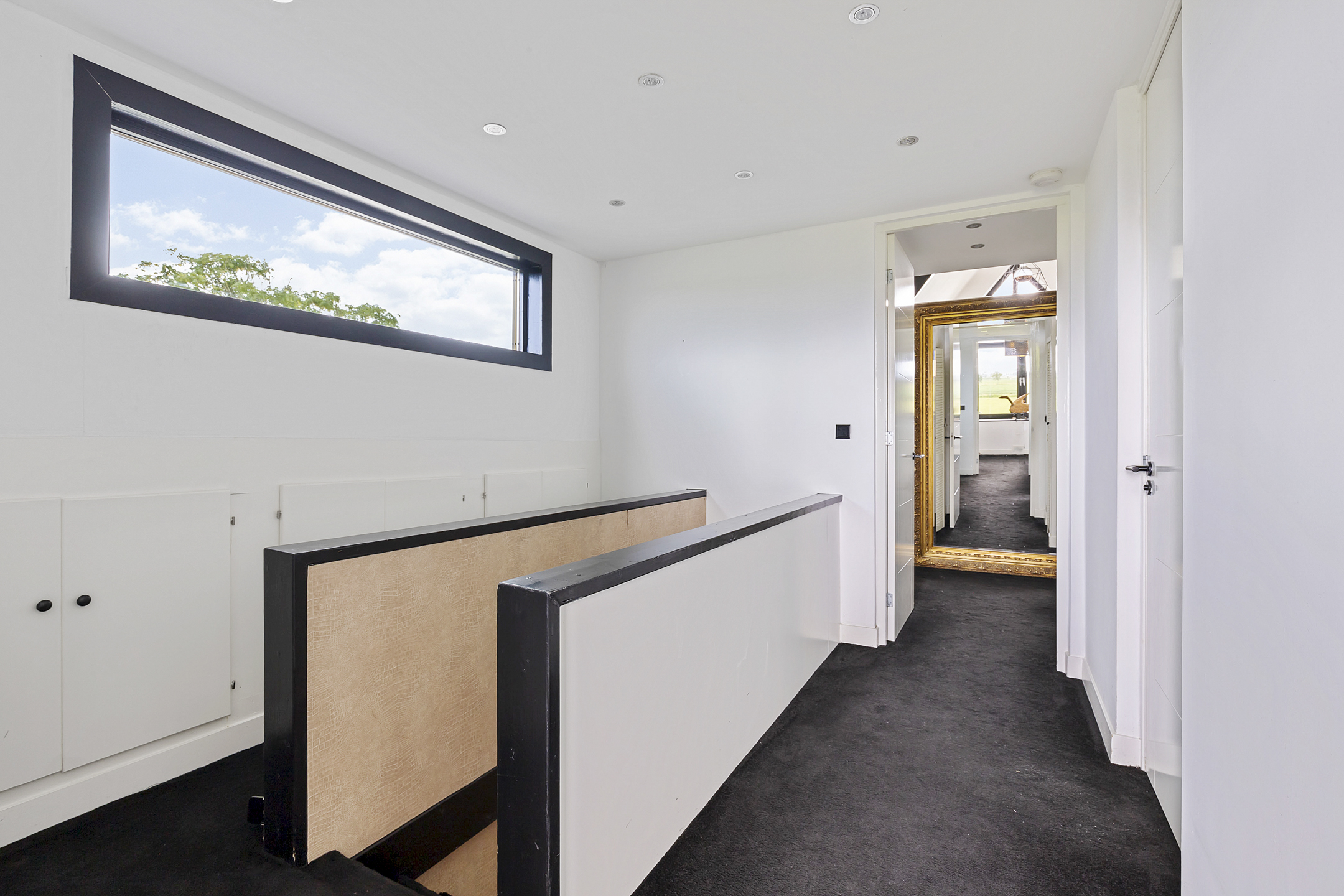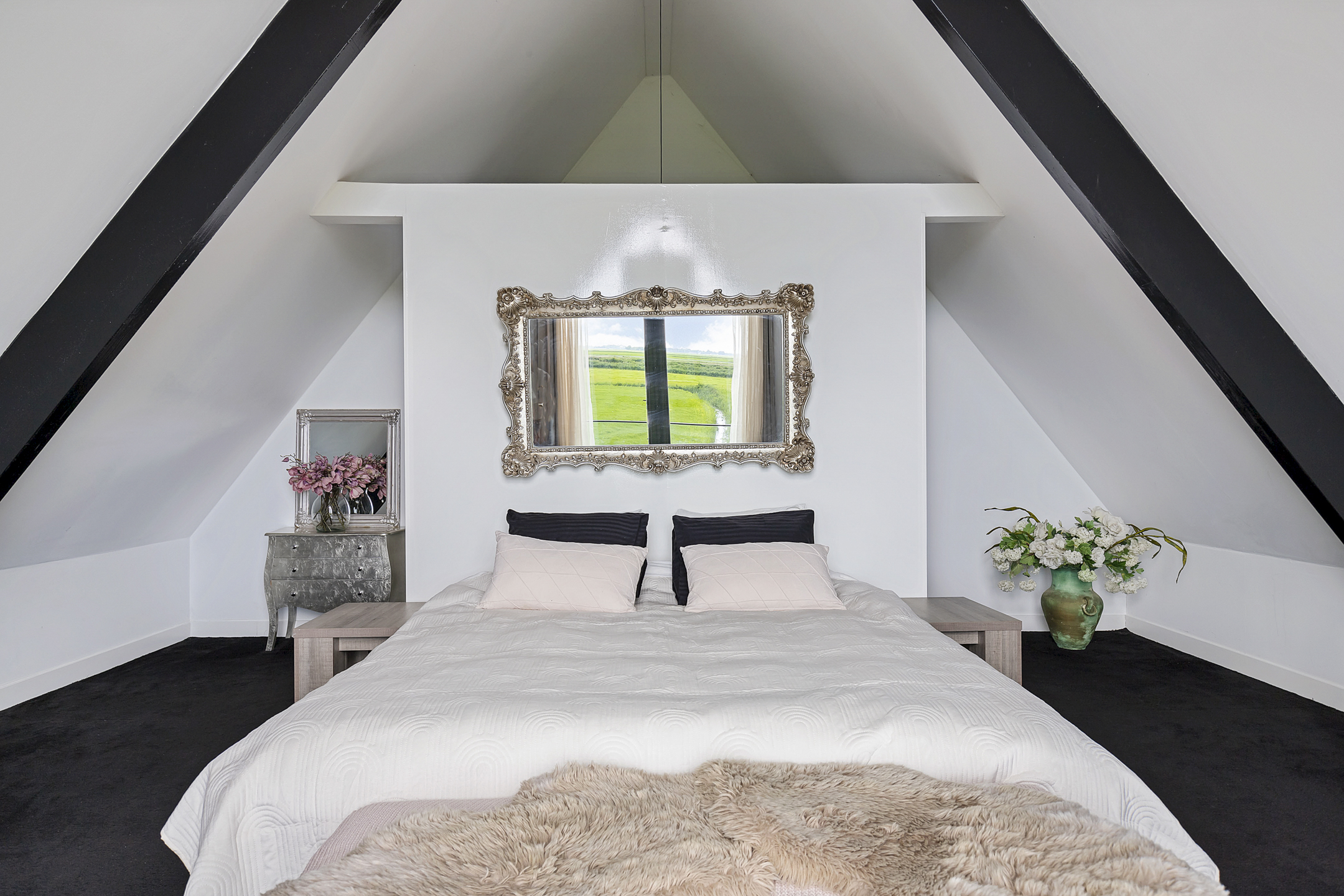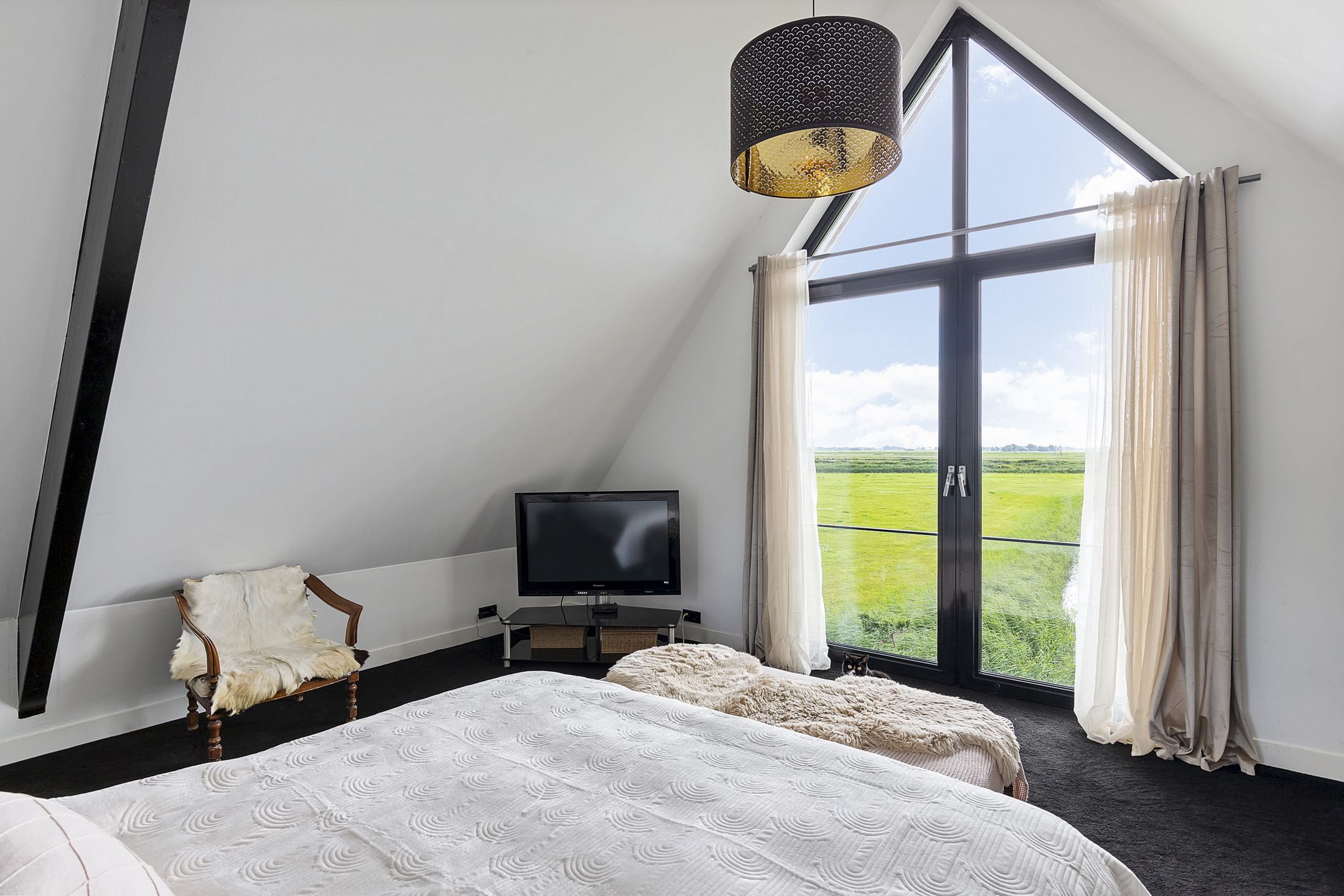 De sfeervolle royale master bedroom met twee inloopkasten onder het schuine dak is gelegen aan de Zuidkant en heeft een kamerhoge raampartij met frans balkon, uitkijkend over de groene weides met aansluitend het Van Harinxmakanaal. Hier word je blij wakker en krijg je energie en zin om de dag te beginnen.