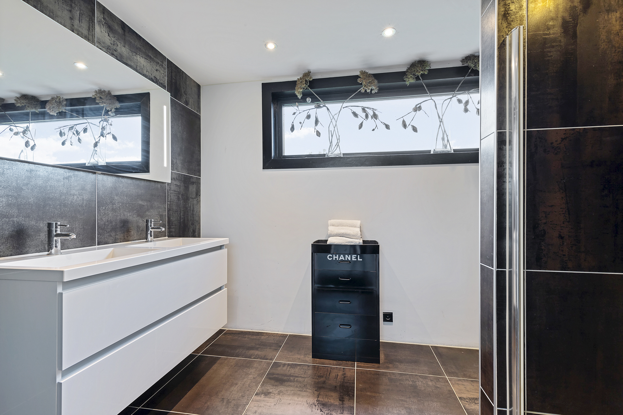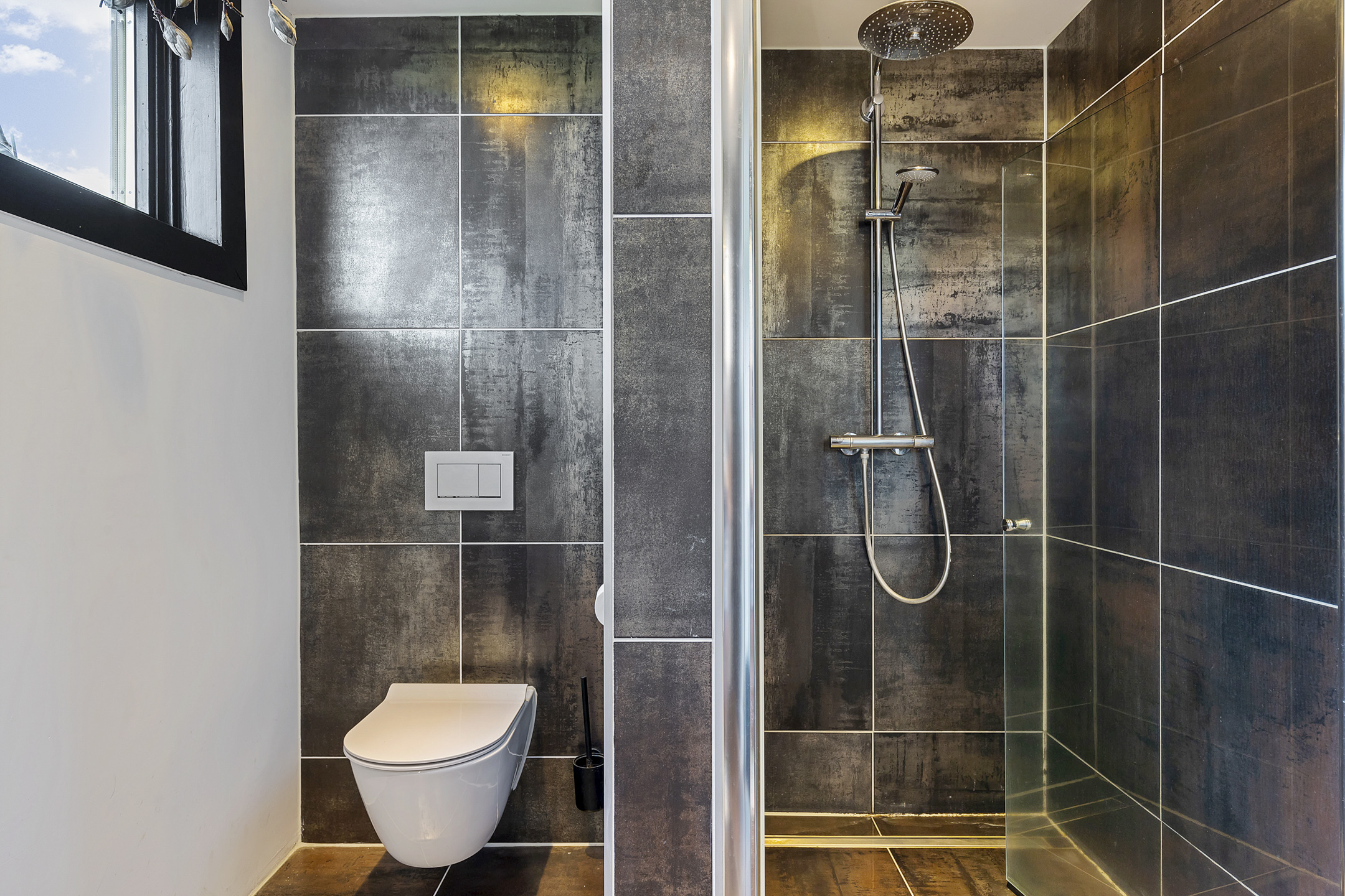 De chique badkamer met stijlvol Italiaans tegelwerk heeft een wat hoger gelegen raampartij in de brede dakkapel. De badkamer is voorzien van een inloopdouche, toilet en wastafelmeubel.