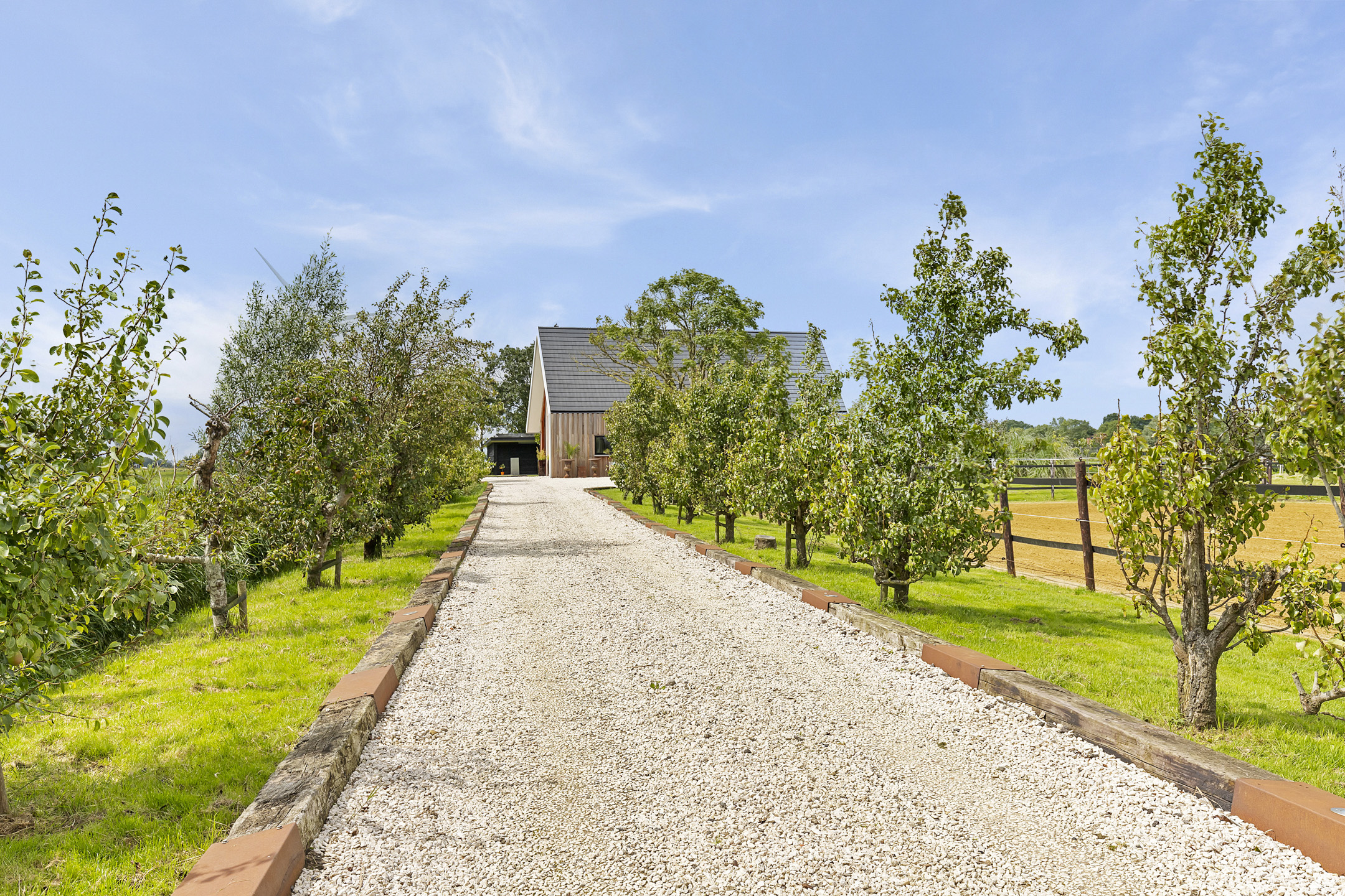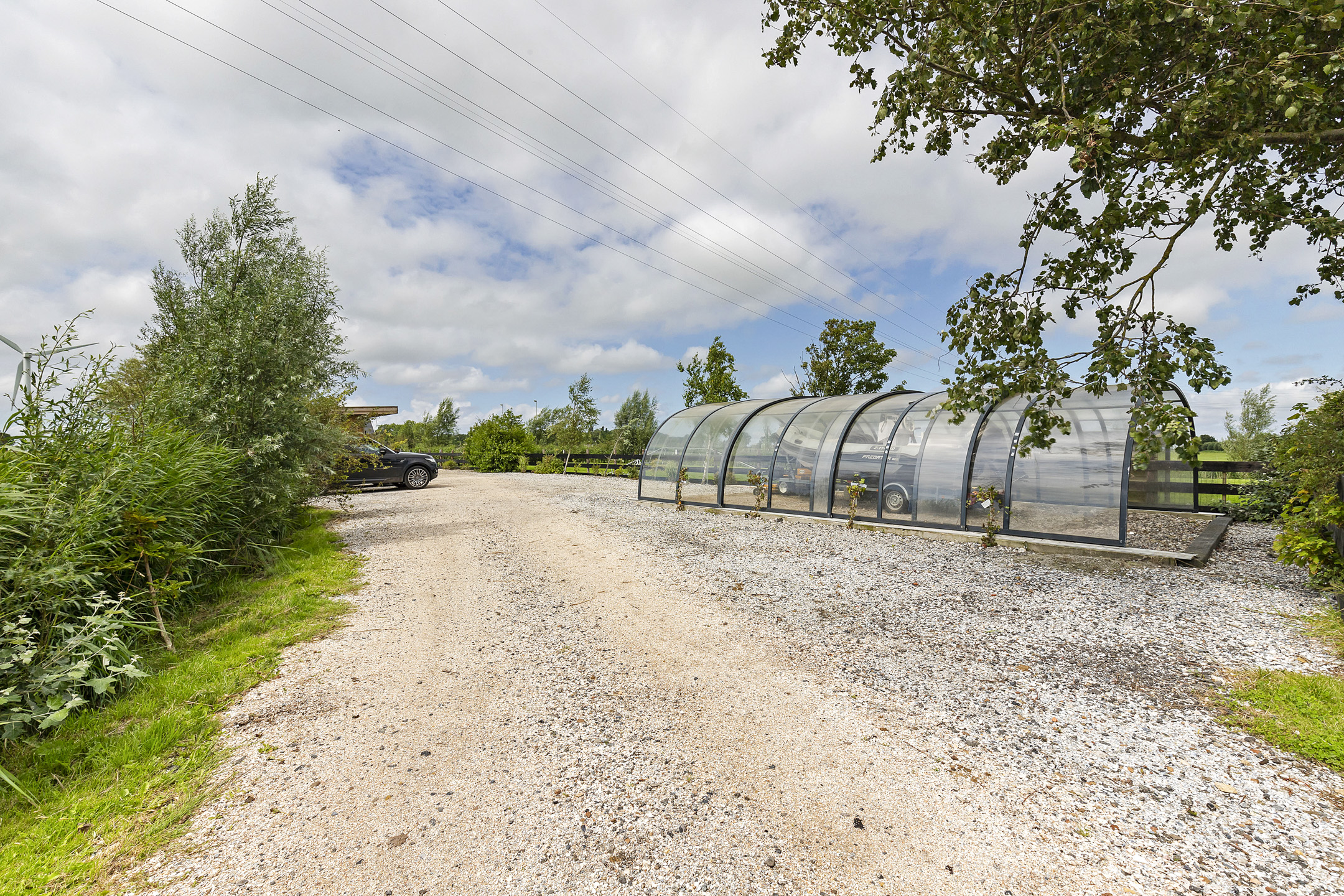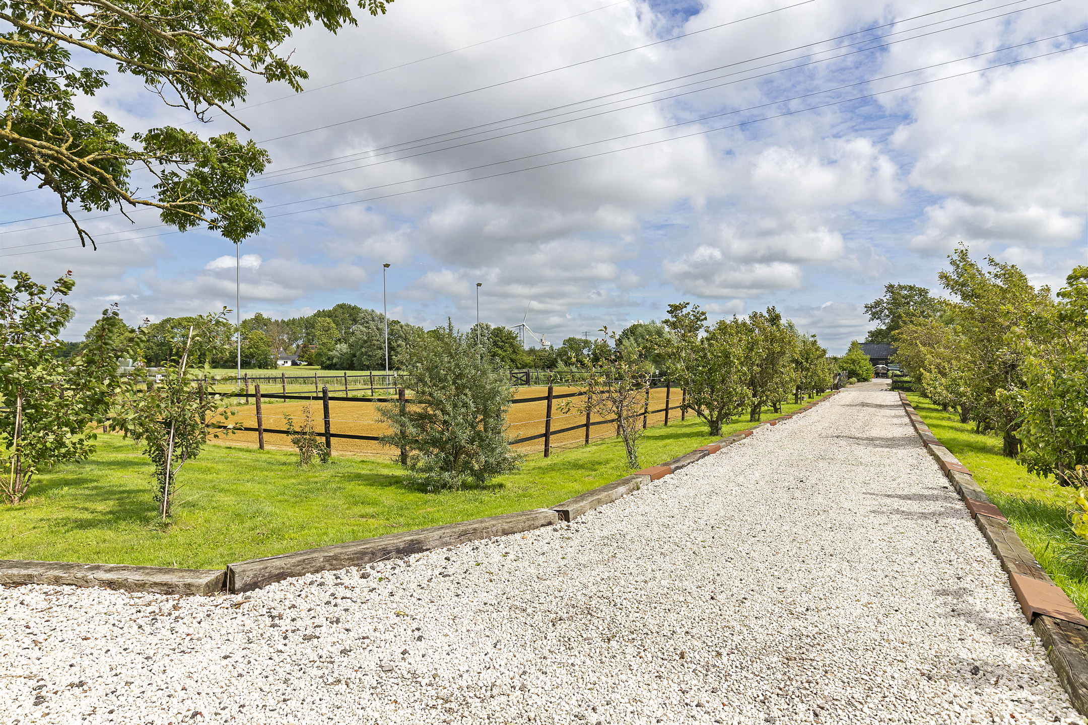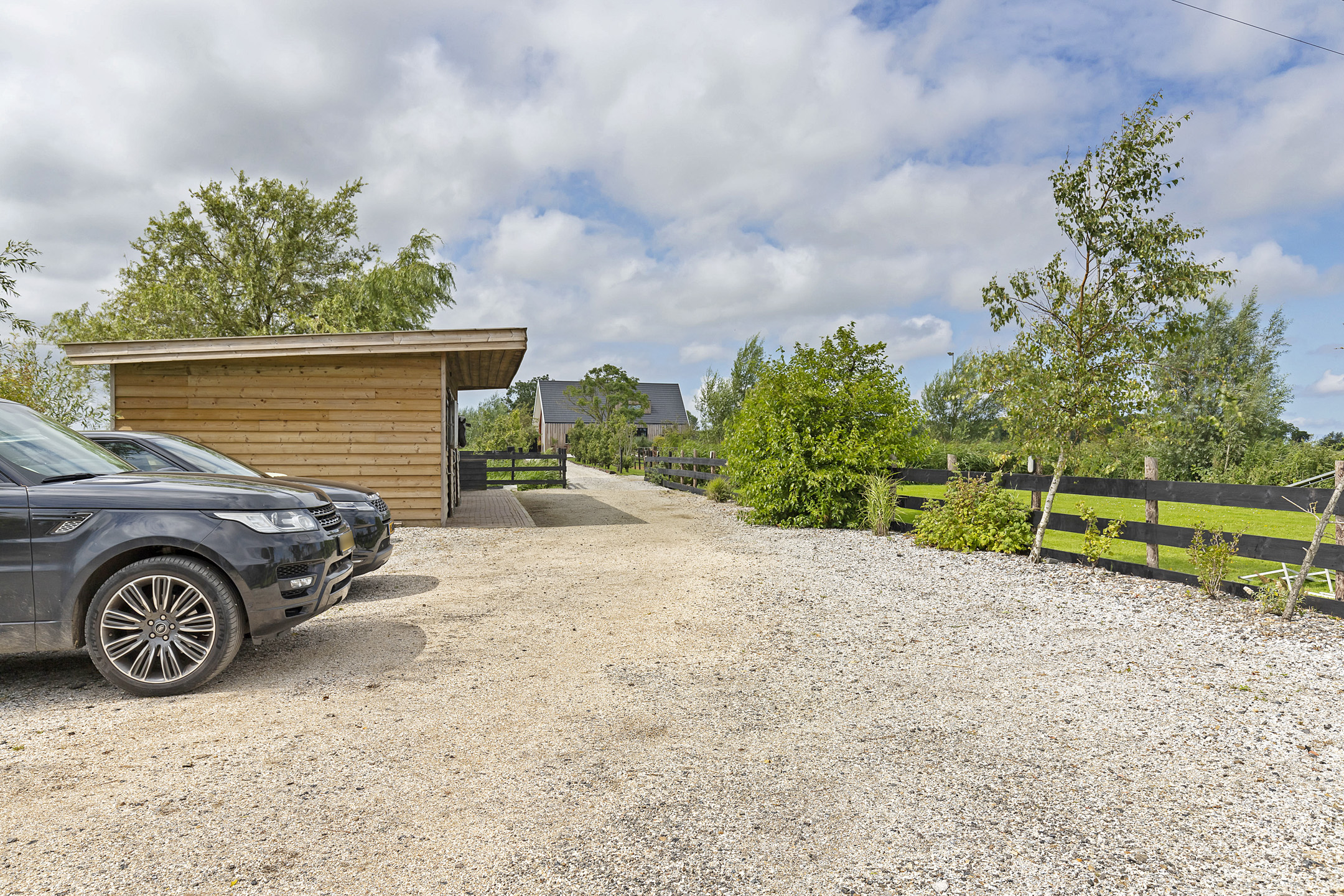 De oprit naar het woonhuis, de garages en stal is voorzien van split met bloemenborders afgezet met Cortensstaal voorzien van tuinverlichting. Er is voldoende parkeergelegenheid op eigen terrein zowel bij de stallen als bij de woning voor meerdere auto’s.