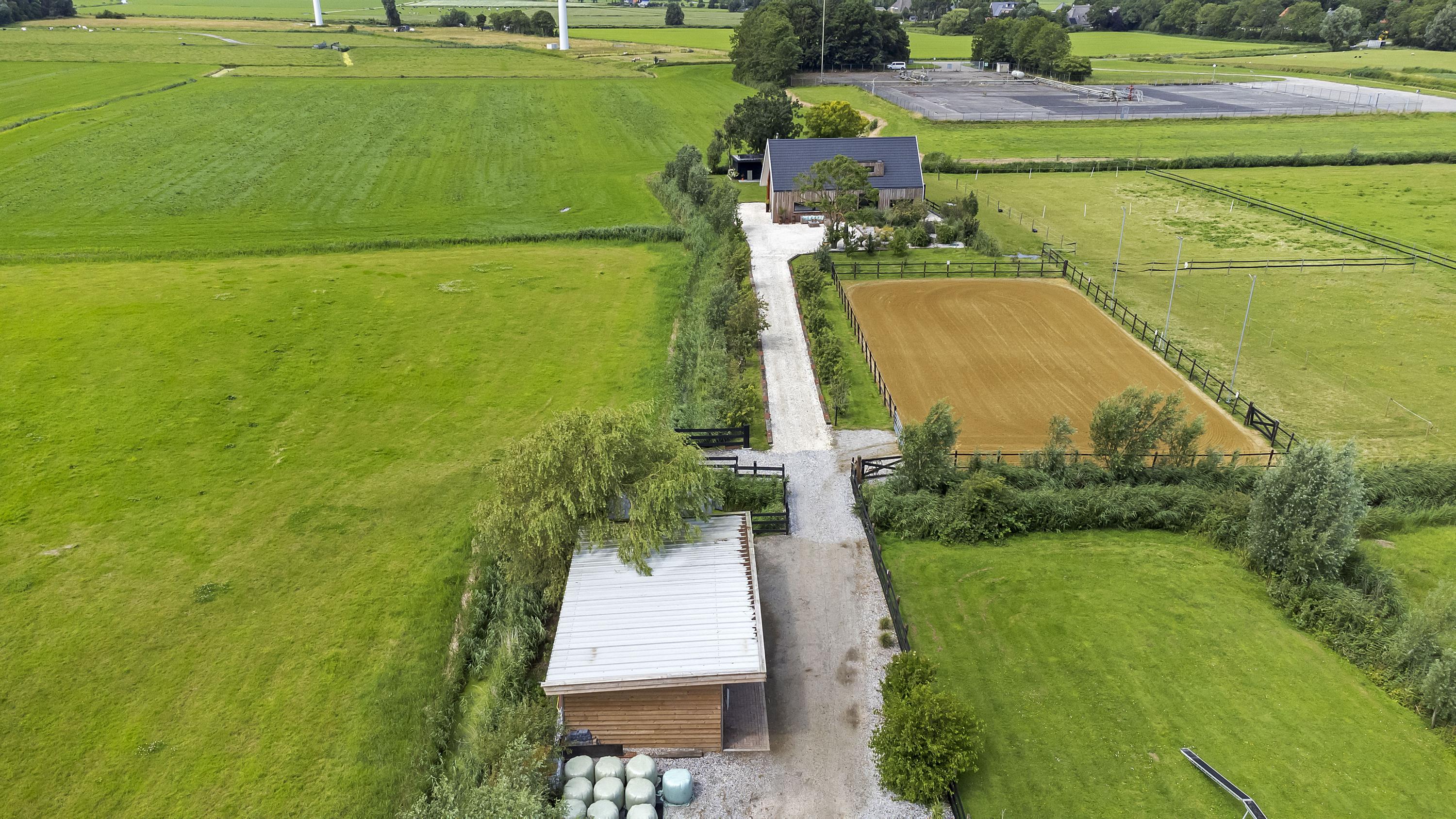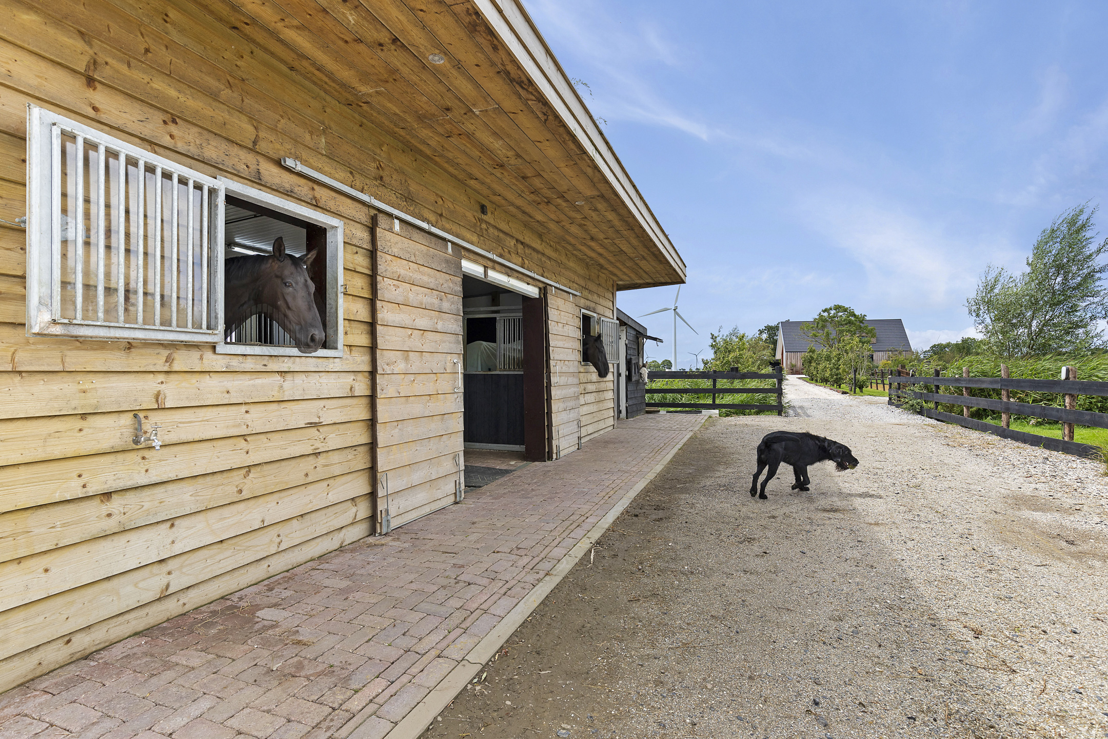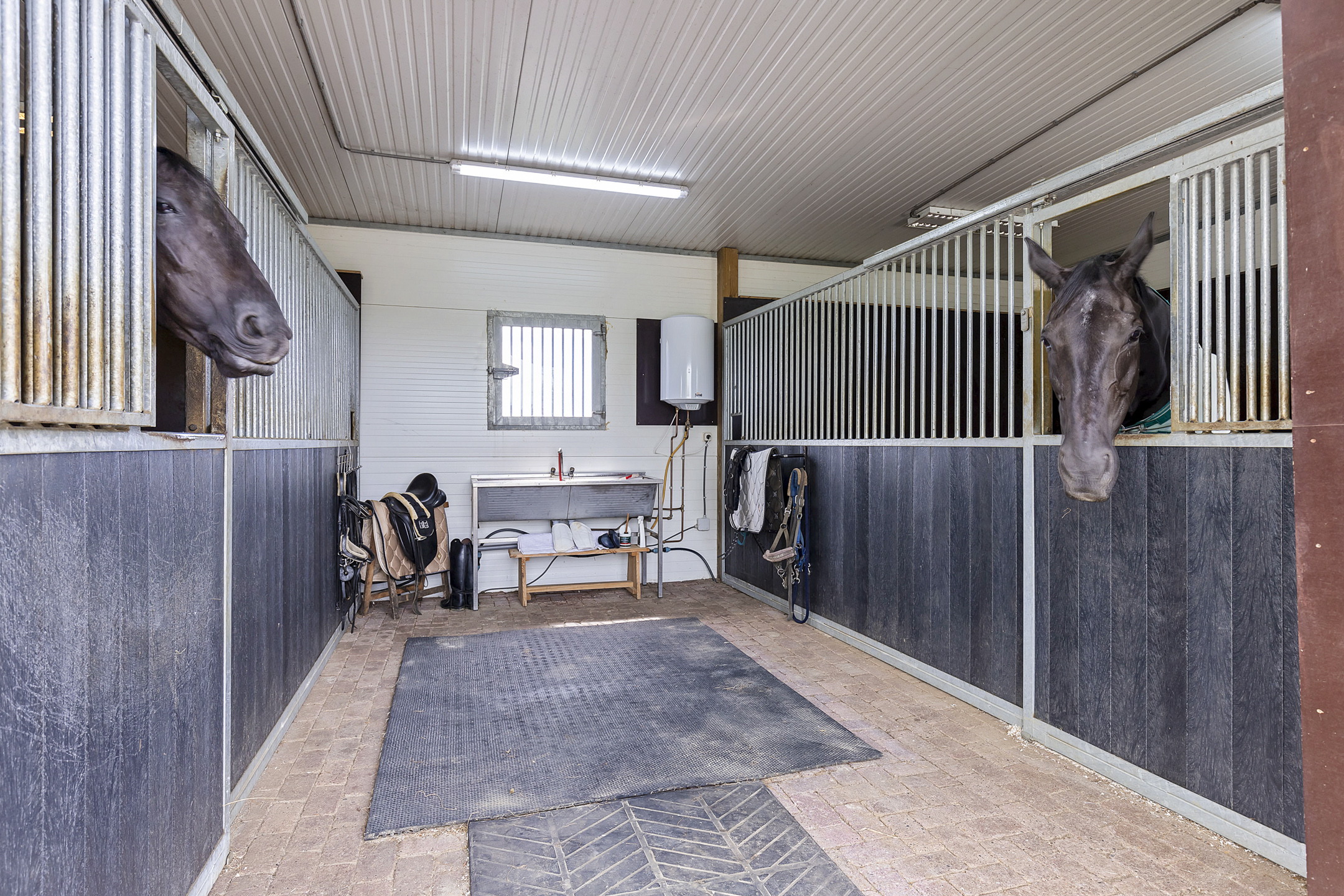 Halverweg de oprijlaan is het stallencomplex gelegen. Er zijn achtereenvolgens twee riante paardenboxen met inpandige poetsplaats voorzien van warm en koud stromend water in het midden, daarnaast een fourage-/zadelkamer met vervolgens nog een kleinere stal waar Jil de stokoude ezel huist. Vanuit de stal is de achtergelegen paardenwei (ruim 1.7ha) bereikbaar en tevens de tegenover gelegen paardenbak (20x40m) met soepele bodem en buitenverlichting. Mocht er geen interesse zijn in het houden van paarden dan is dit complex bijvoorbeeld ook te verbouwen tot gastenverblijf.
