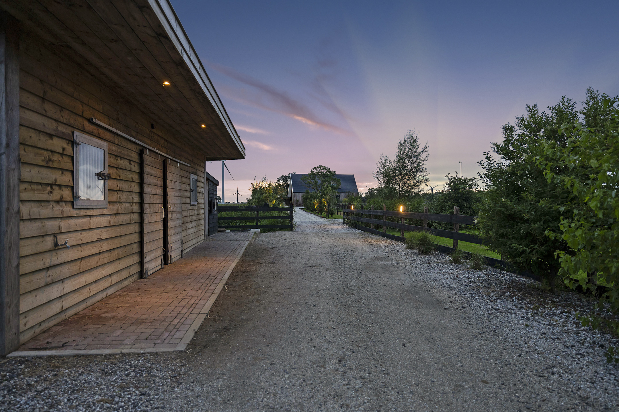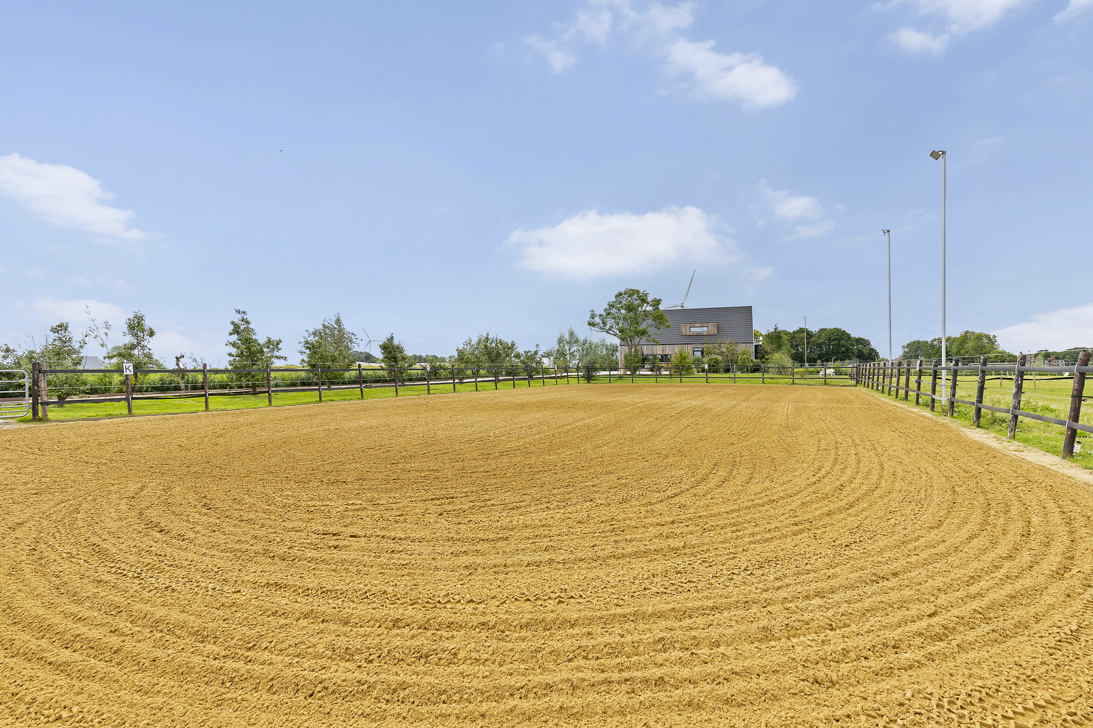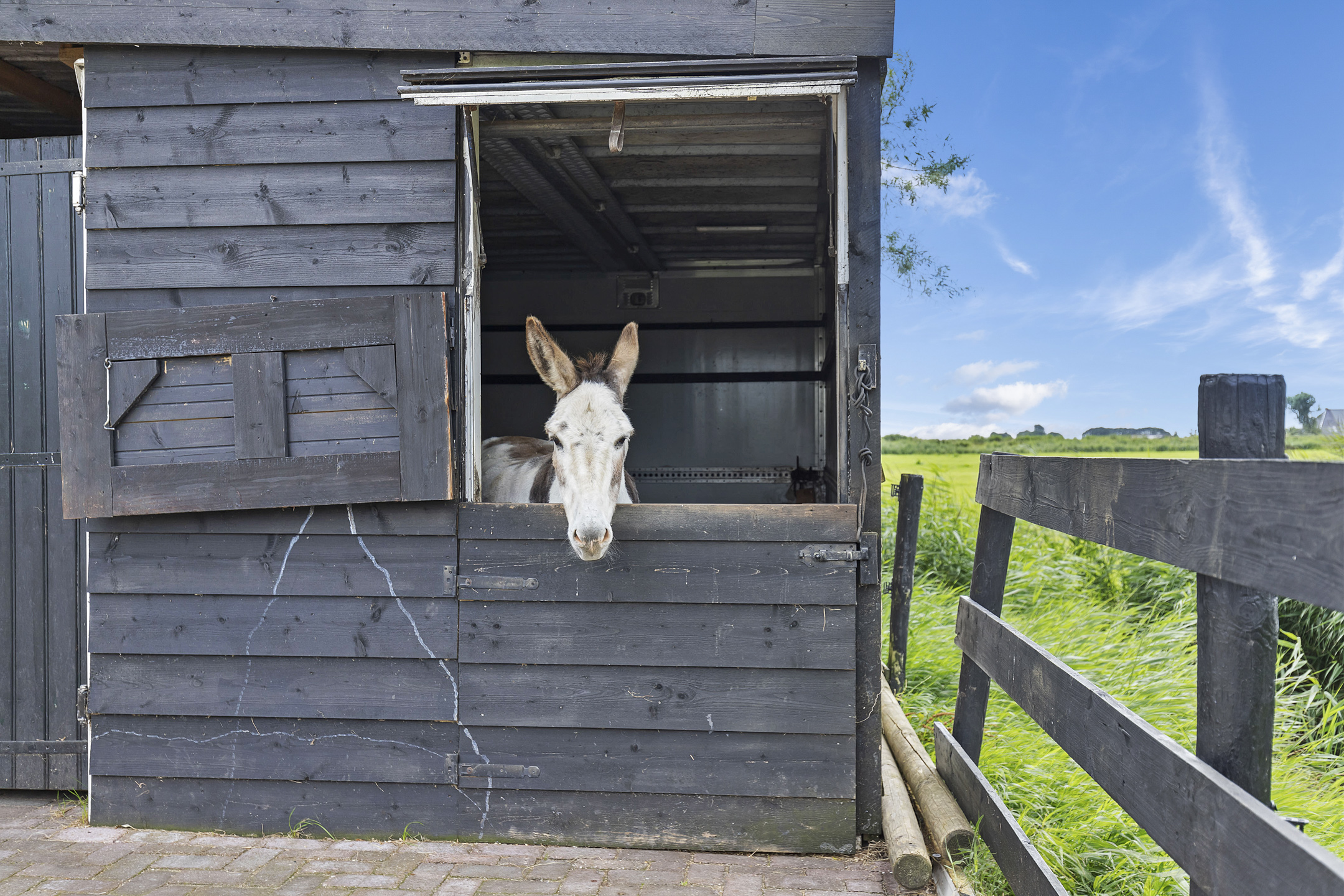 Halverweg de oprijlaan is het stallencomplex gelegen. Er zijn achtereenvolgens twee riante paardenboxen met inpandige poetsplaats voorzien van warm en koud stromend water in het midden, daarnaast een fourage-/zadelkamer met vervolgens nog een kleinere stal waar Jil de stokoude ezel huist. Vanuit de stal is de achtergelegen paardenwei (ruim 1.7ha) bereikbaar en tevens de tegenover gelegen paardenbak (20x40m) met soepele bodem en buitenverlichting. Mocht er geen interesse zijn in het houden van paarden dan is dit complex bijvoorbeeld ook te verbouwen tot gastenverblijf.