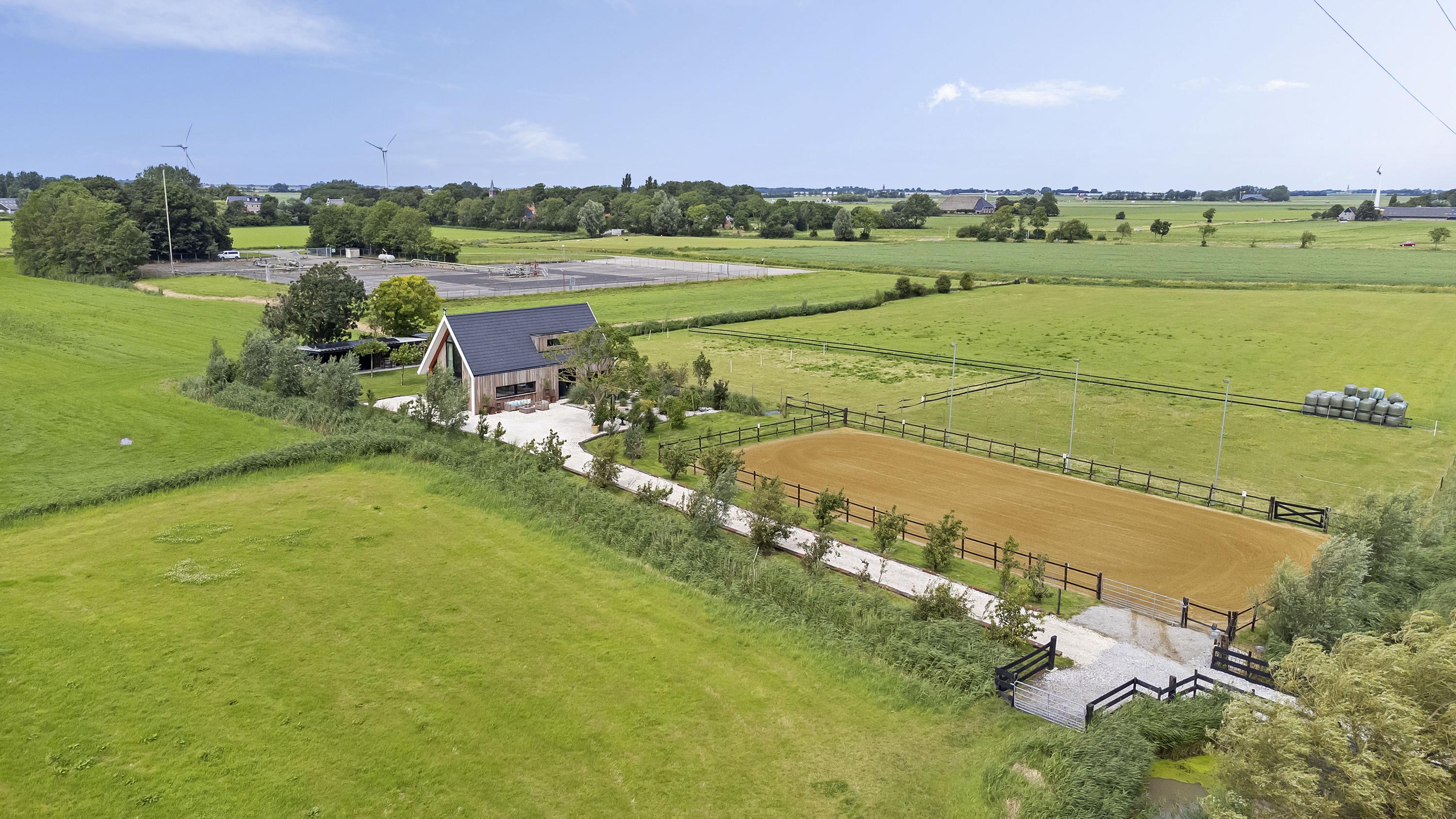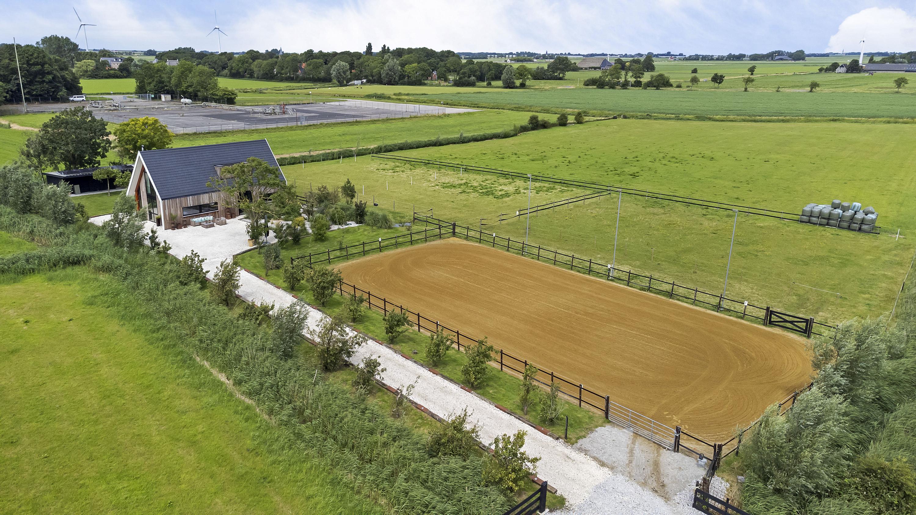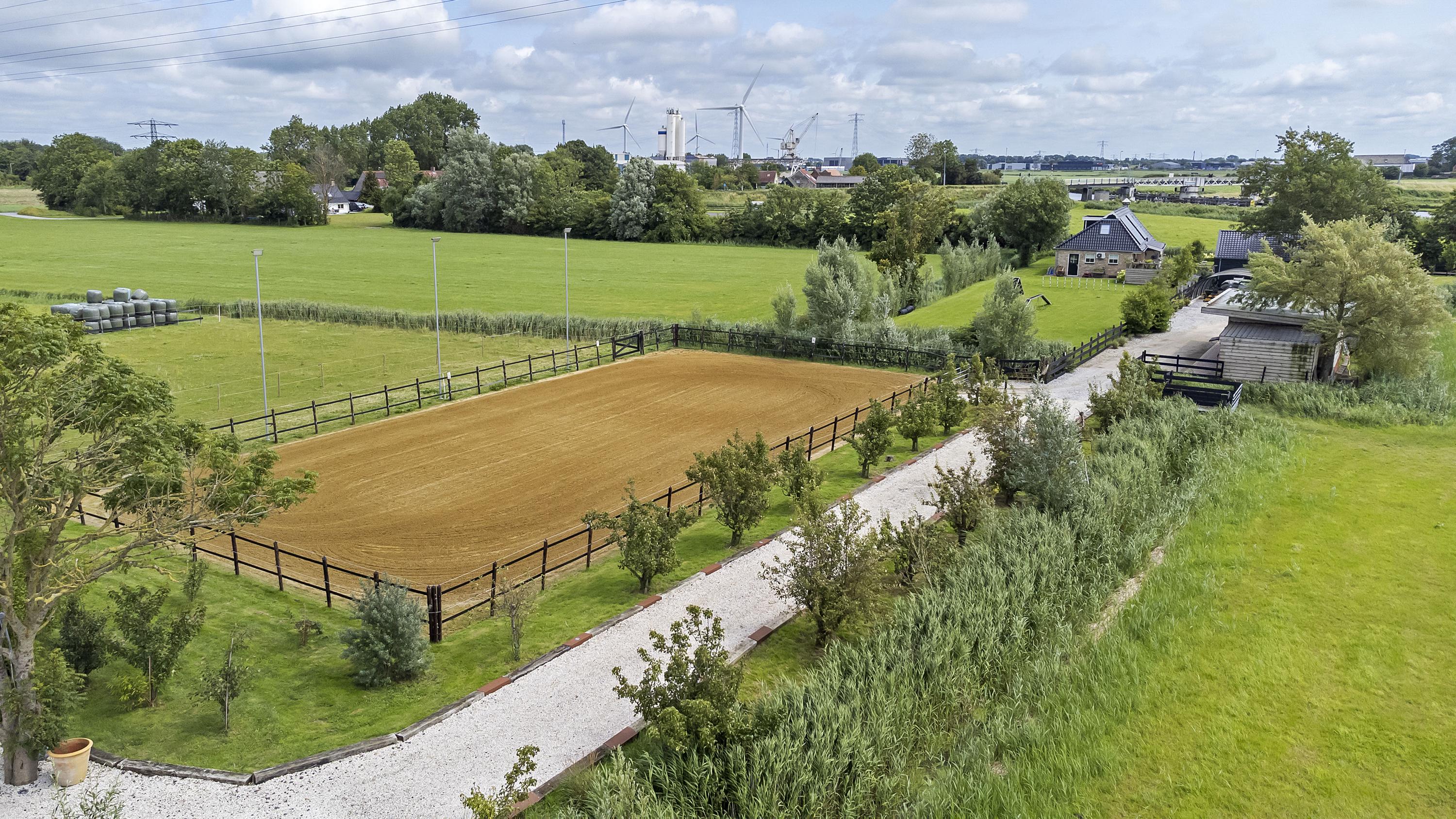 Het ruim 1.7ha weiland omzoomd door een sloot heeft twee toegangen en ligt direct achter de stallen aan het Van Harinxmakanaal. In de huidige situatie lopen de paarden op het perceel achter de woning, dit zal in de nieuwe situatie door ruilverkaveling dus veranderen naar de voorkant (kanaal- en zichtkant) van de woning. De paardenbak 20x40 is voorzien van soepele bodem en verlichting. Het is tevens mogelijk de woning zonder het weiland aan te kopen.
