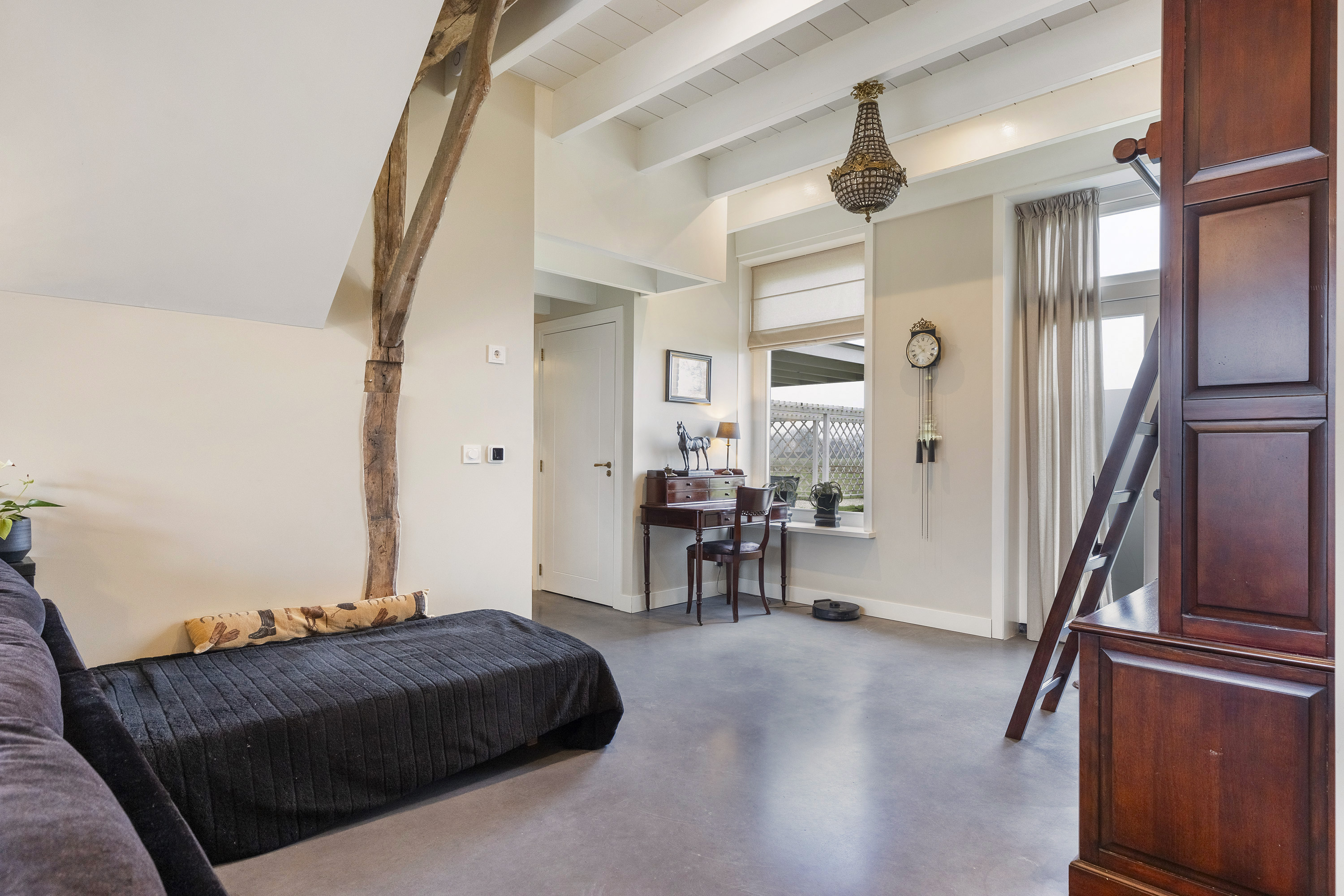 De woonkeuken vormt het hart van de woning. Deze lichte ruimte, met ramen aan drie zijden, hoge nok en een fraai balkenplafond, biedt een uitnodigende plek om te koken en te leven. De houthaard en vloerverwarming zorgen voor een aangename sfeer. Aansluitpunten voor een exclusieve keukenopstelling met kookeiland zijn reeds aanwezig, zodat u deze ruimte geheel naar eigen wens kunt realiseren. Via dubbele tuindeuren is er directe toegang tot de veranda en de tuin, waar het uitzicht vrij en weids is.
