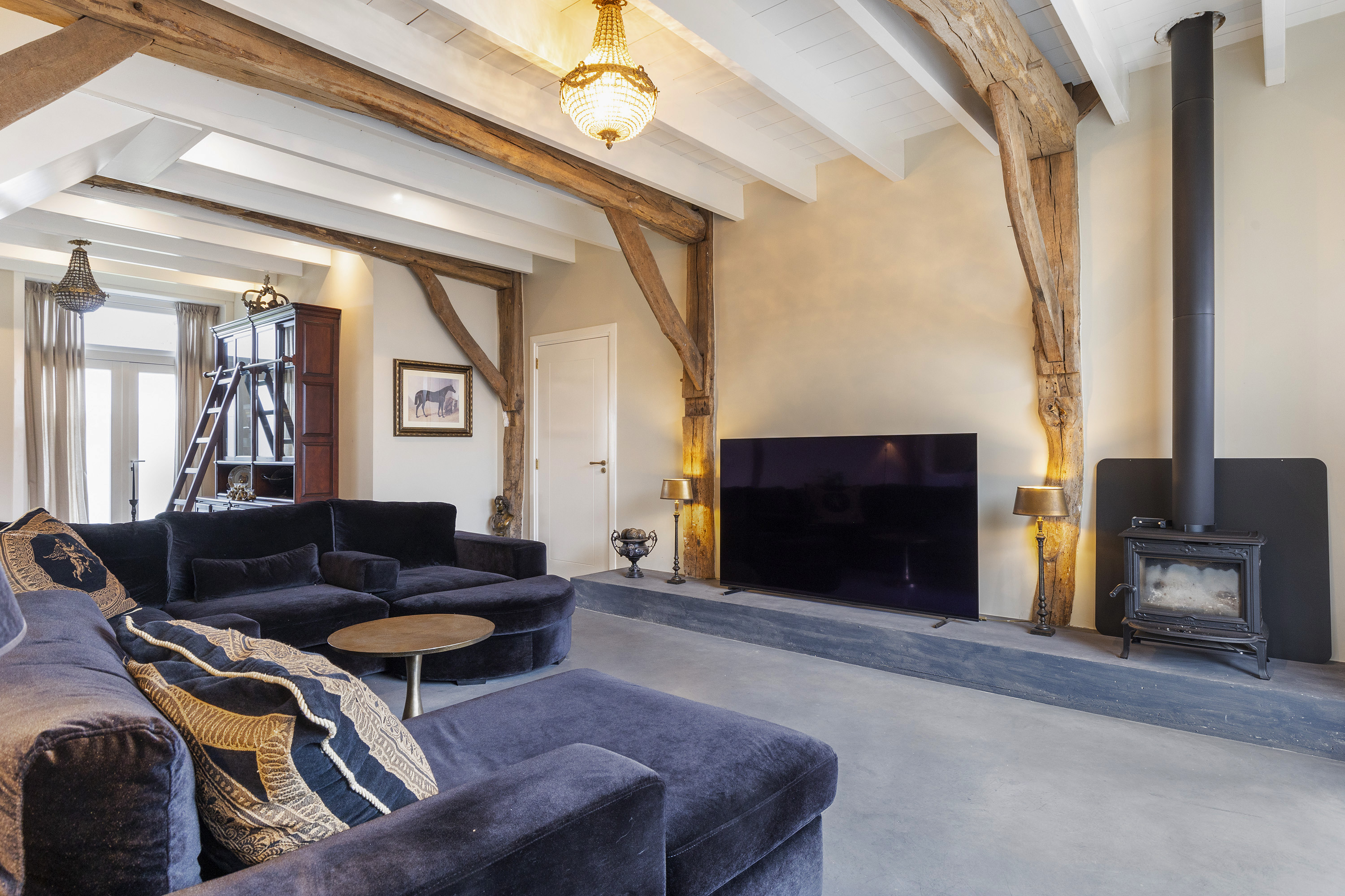 De woonkamer is eveneens royaal opgezet en kenmerkt zich door een prachtige combinatie van witte houten plafondbalken, robuuste draagbalken en een gevlinderde betonvloer. De houthaard en openslaande deuren naar de tuin zorgen voor een natuurlijke verbinding tussen binnen en buiten. De ruimte leent zich uitstekend voor meerdere zitgedeeltes, waardoor een comfortabele en sfeervolle indeling eenvoudig te realiseren is.