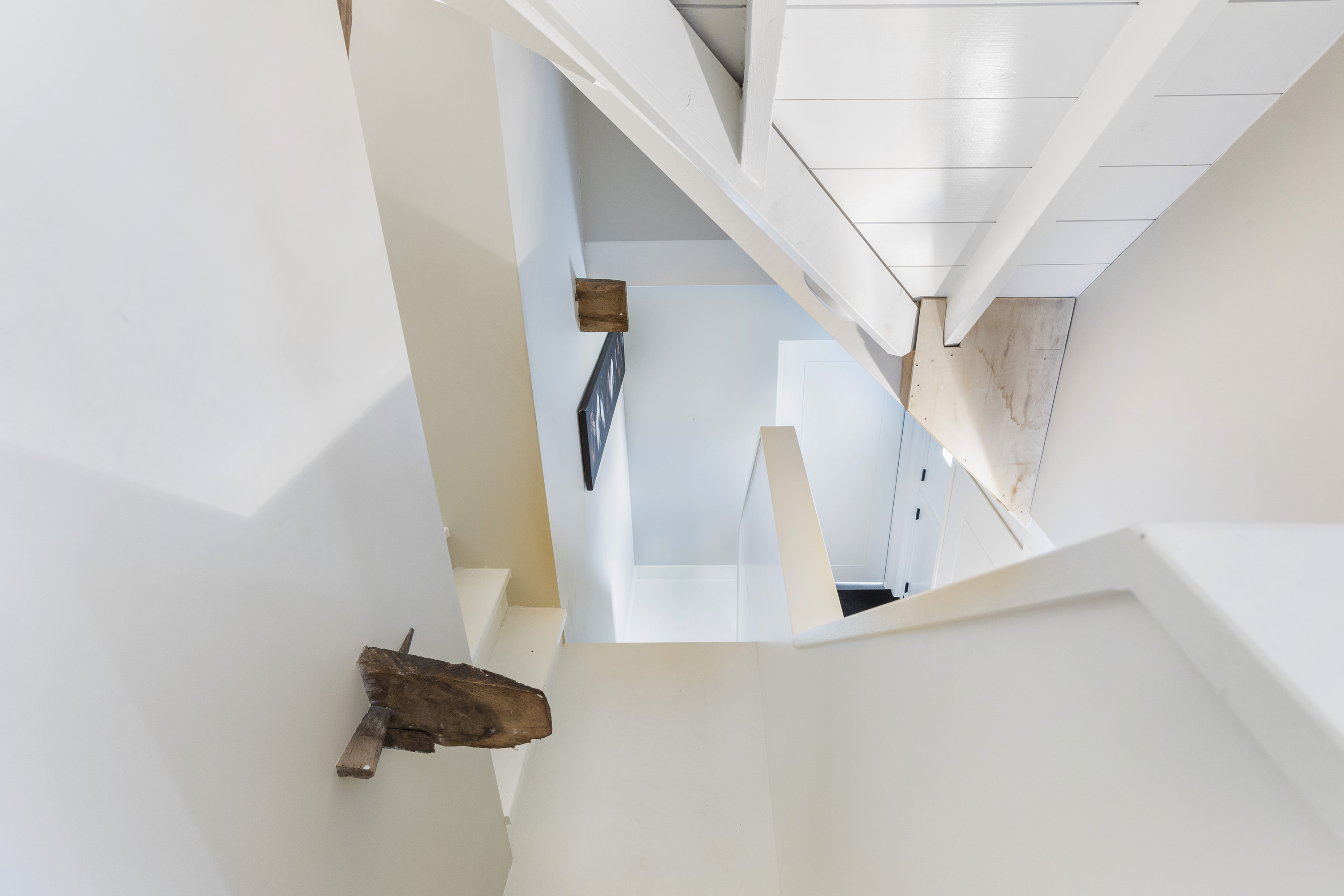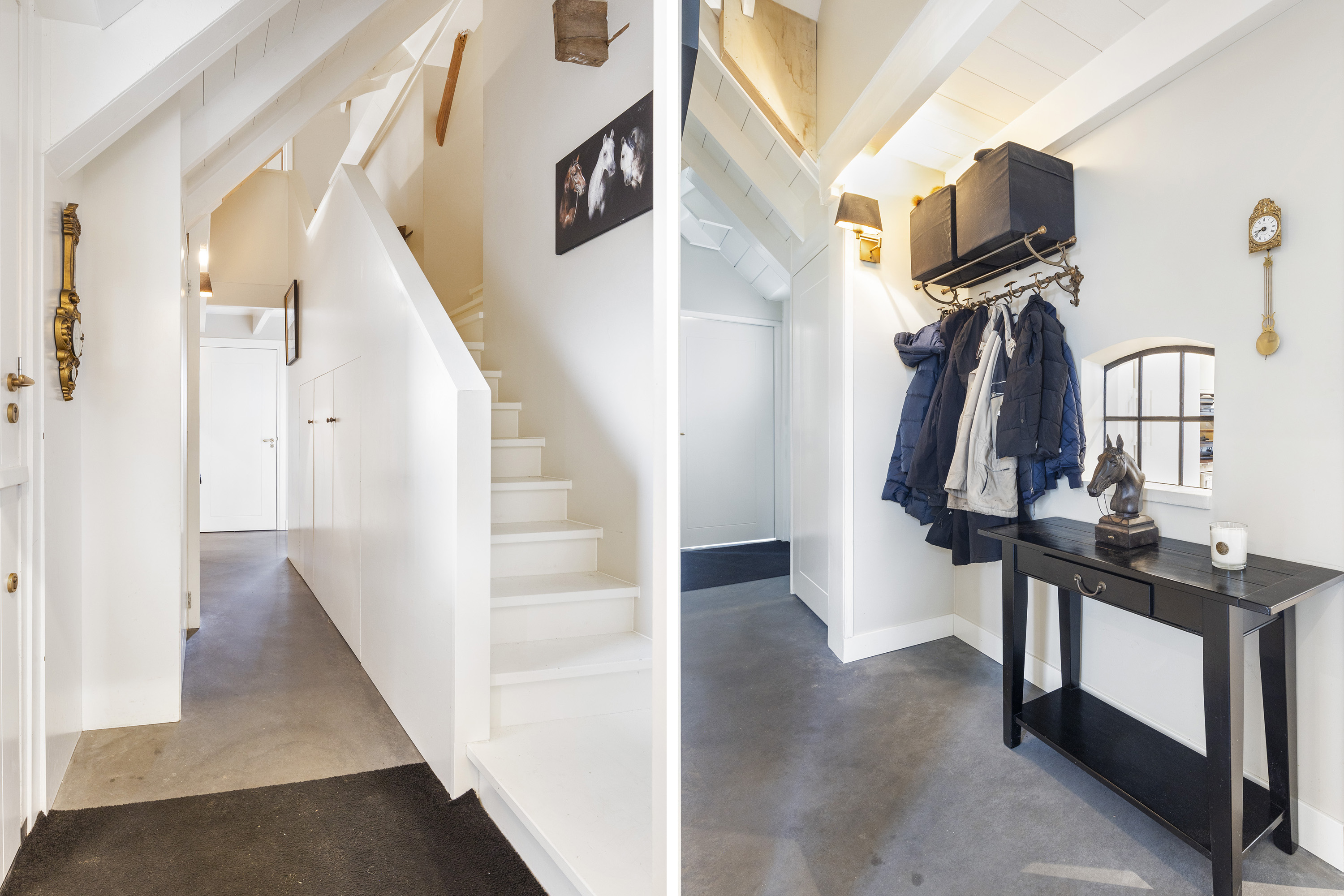 Via de karakteristieke tweedelige voordeur met venster betreedt u de royale hal, waar direct de ruimtelijkheid en kwaliteit voelbaar zijn. Hier bevinden zich de meterkast (18 groepen) en een praktische ingebouwde kastruimte onder de trap.