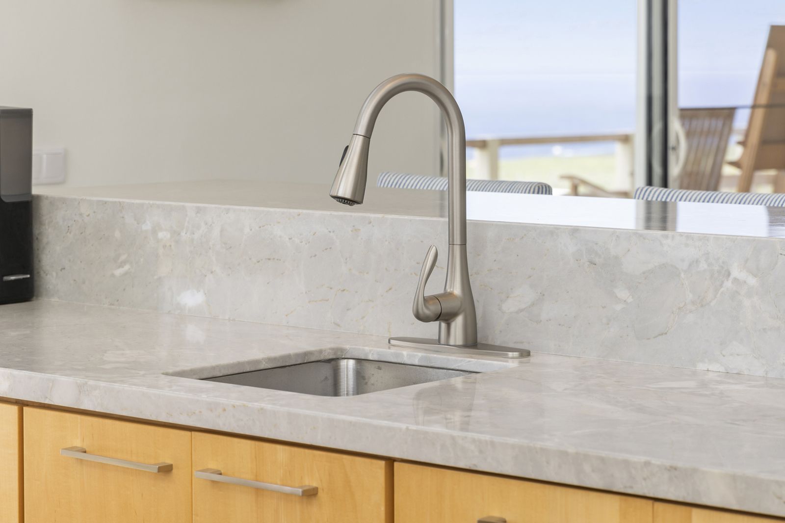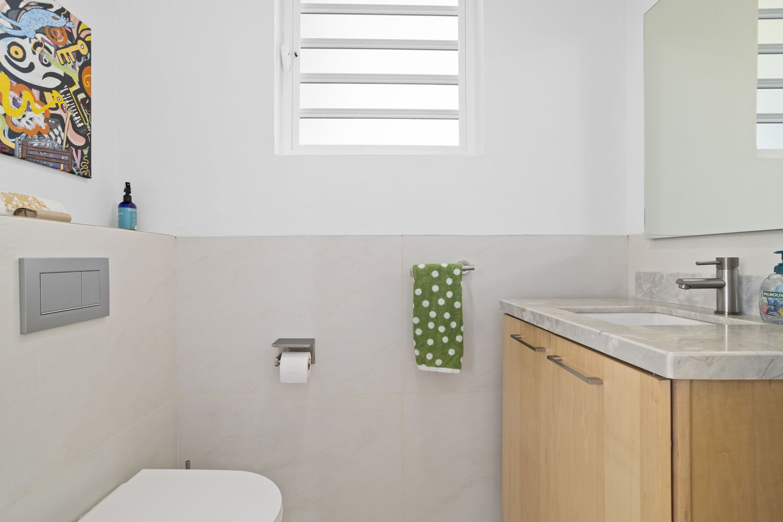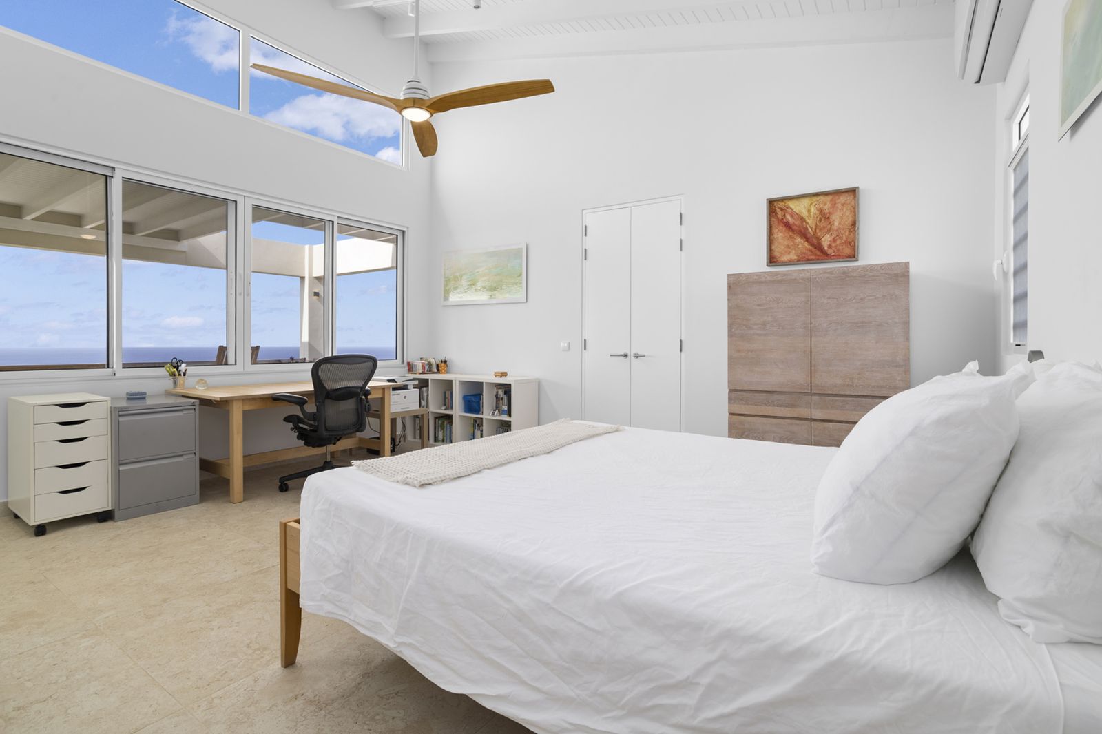 De ruime master bedroom kijkt uit over de Caribische Zee en beschikt over een verfijnde ensuite badkamer met dubbele wastafel en inloopdouche. De keuken met dubbel kookeiland is perfect voor wie graag gasten ontvangt, met veel werkruimte en een open verbinding naar de bar en het buitenterras. Daarnaast beschikt de woning over een grote, afsluitbare bergruimte voor watersportmateriaal, een zeldzame luxe op Bonaire.