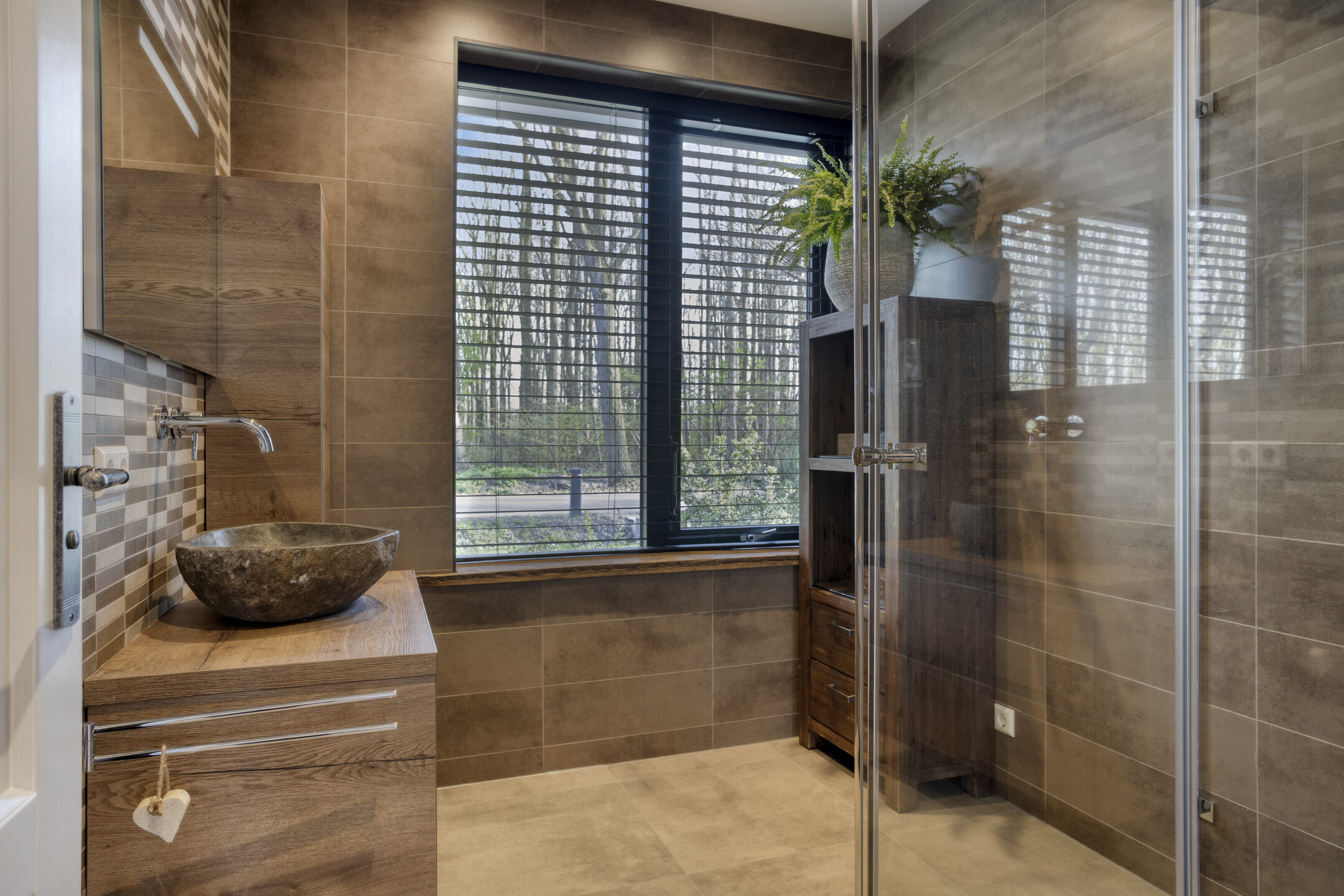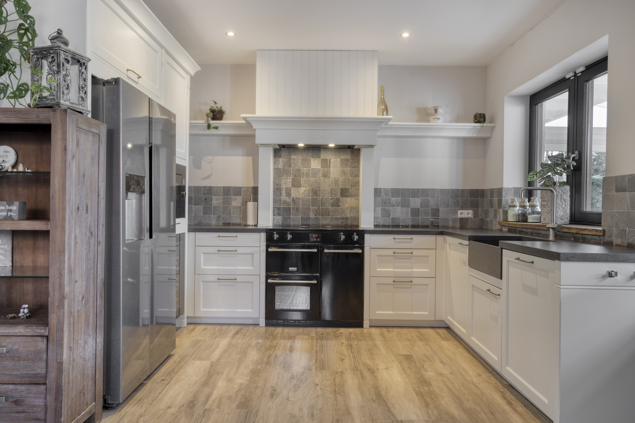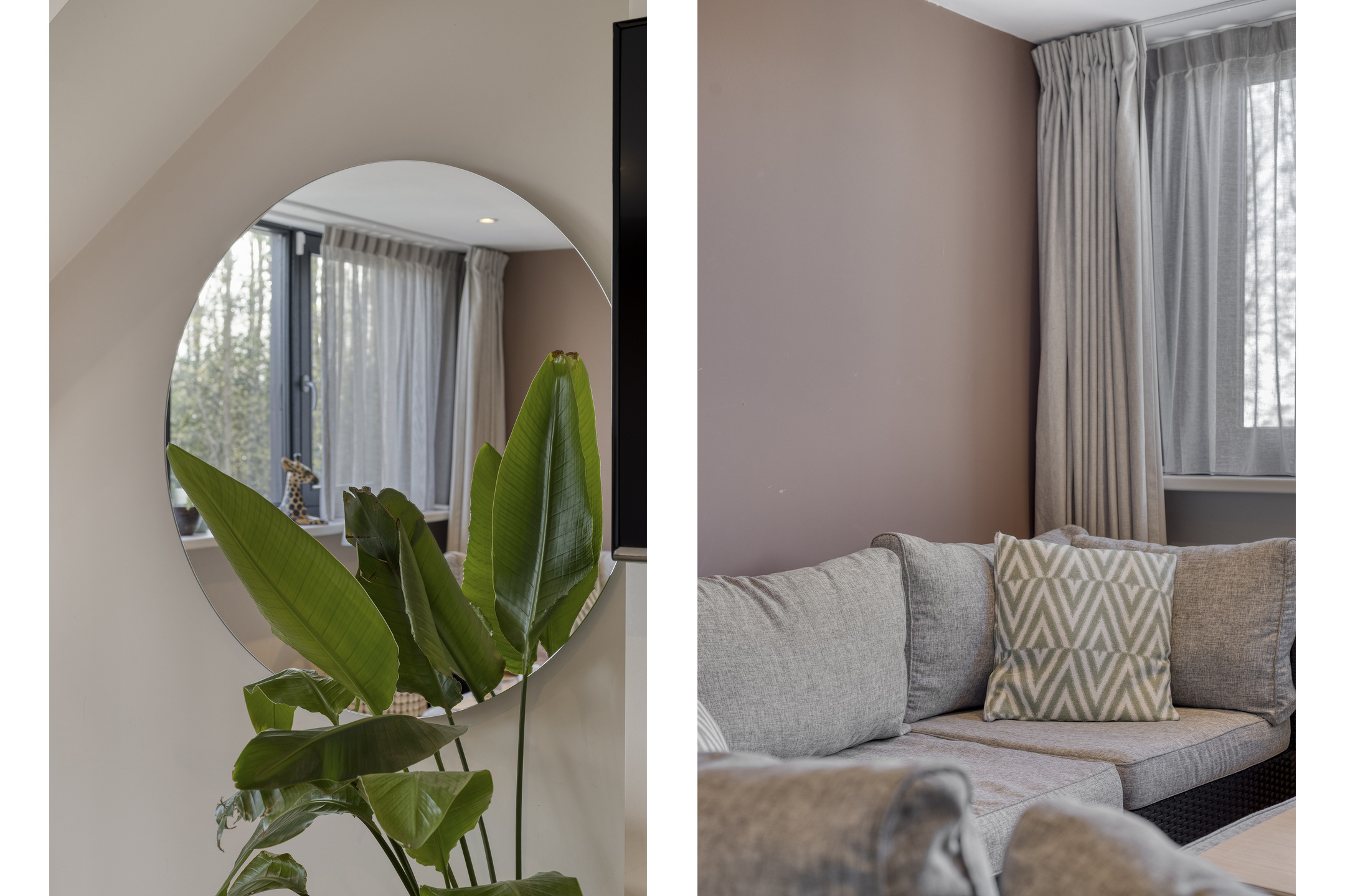 De begane grond biedt een lichte en sfeervolle woonkamer met houthaard en een open keuken voorzien van alle moderne inbouwapparatuur, inclusief wijnkoeler. Vanuit de woonkamer heeft u zicht op de tuin en directe toegang tot de luxe veranda. Fraai extra kenmerk is de aanwezigheid van de hoofdslaapkamer met een stijlvolle badkamer en-suite op de begane grond, wat deze woning uitermate geschikt maakt voor gelijkvloers wonen.