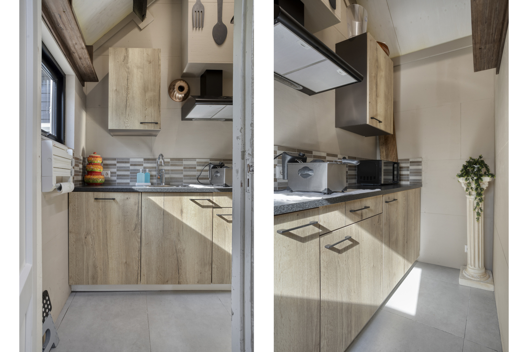 De voormalige garage is praktisch ingericht als bijkeuken met alle benodigde aansluitingen t.b.v. huishoudelijke apparatuur. Door de aanwezigheid van een dubbele deur kan de ruimte ook prima dienen als (fietsen)berging, wat bijdraagt aan het gebruiksgemak van de woning.
