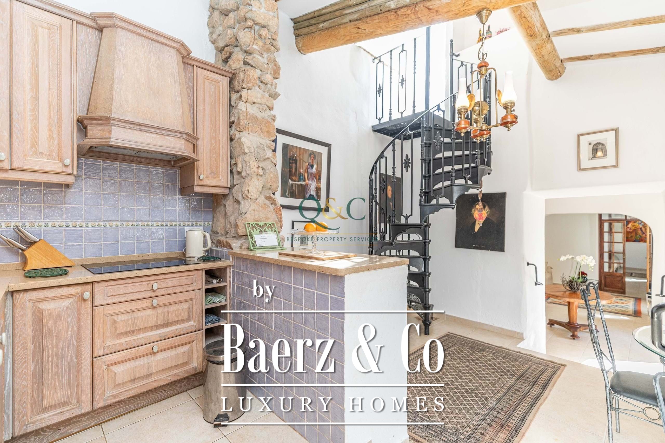 Binnen zorgen twee slaapkamers met en-suite badkamers voor zowel stijl als functionaliteit, waarvan één met douche en de ander met ligbad én douche. De originele stenen muur in de volledig uitgeruste keuken en ontbijtruimte zorgt voor een tastbare verbinding met de plek, terwijl plafonds van bamboe en houten balken bijdragen aan de kenmerkende warmte van het huis. Een houtkachel en duo-therm radiatoren van natuursteen bieden comfortabel wonen in elk seizoen, aangevuld met airconditioning die entree en woonkamer subtiel koelt. Een extra kantoorruimte biedt veelzijdigheid en gemak.