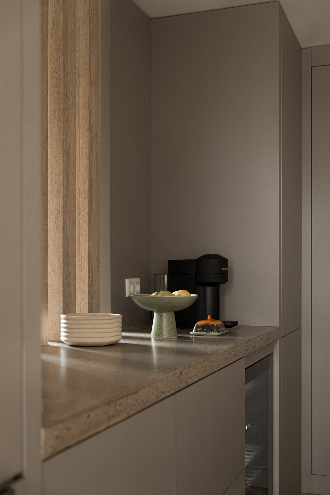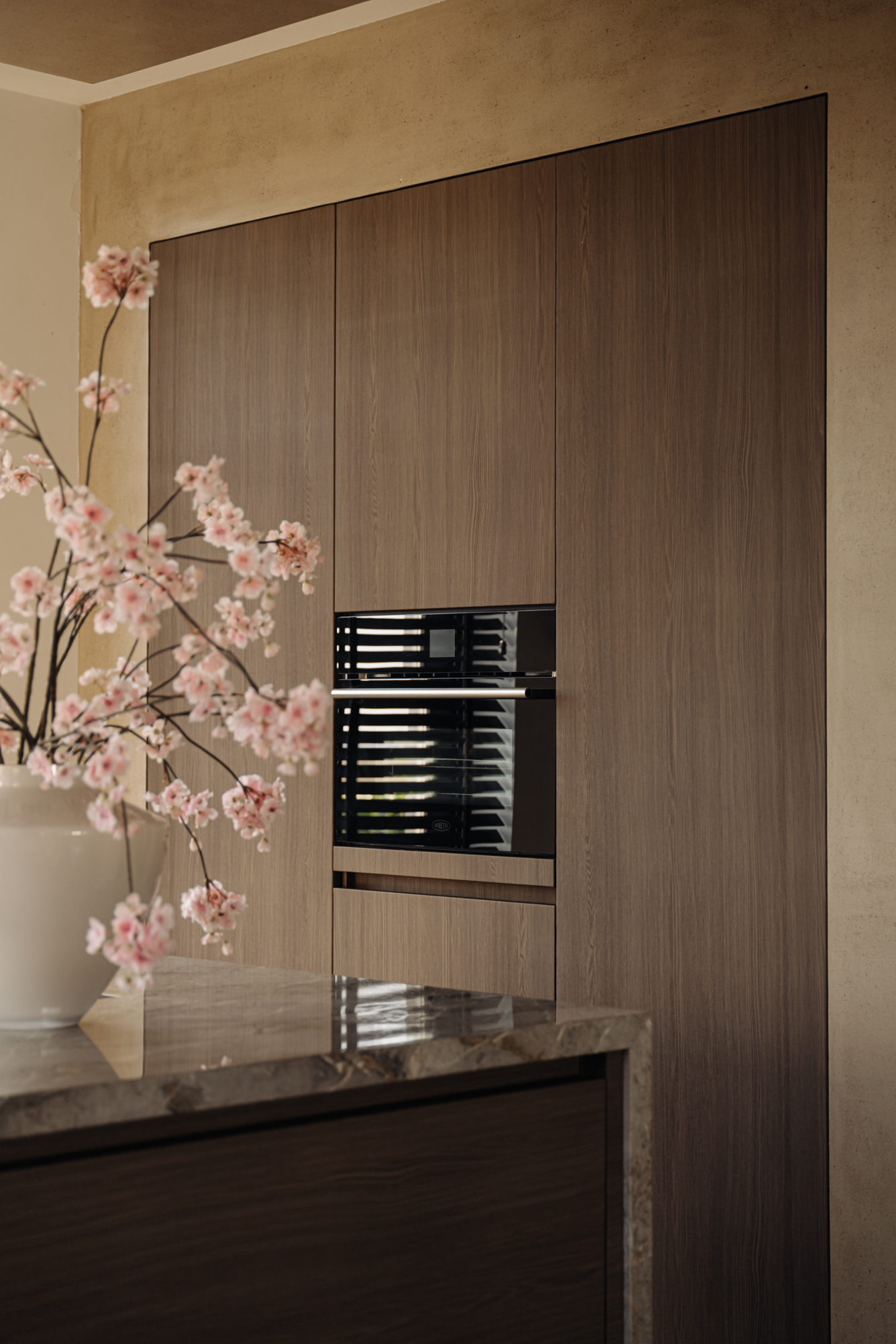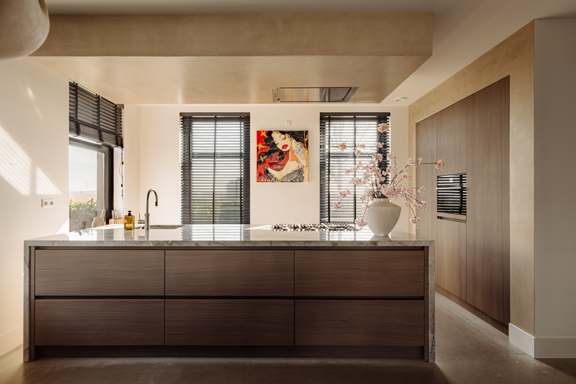 De living, gezellige woonkeuken met kookeiland / eetkamer en de zithoek met open haard, vormen de plattegrond van deze verdieping in het hoofdgebouw. De woonkeuken is gemaakt van rijke materialen en voorzien van Boretti pitt cooking, Gaggenau wijnklimaatkast en overige inbouwapparatuur.