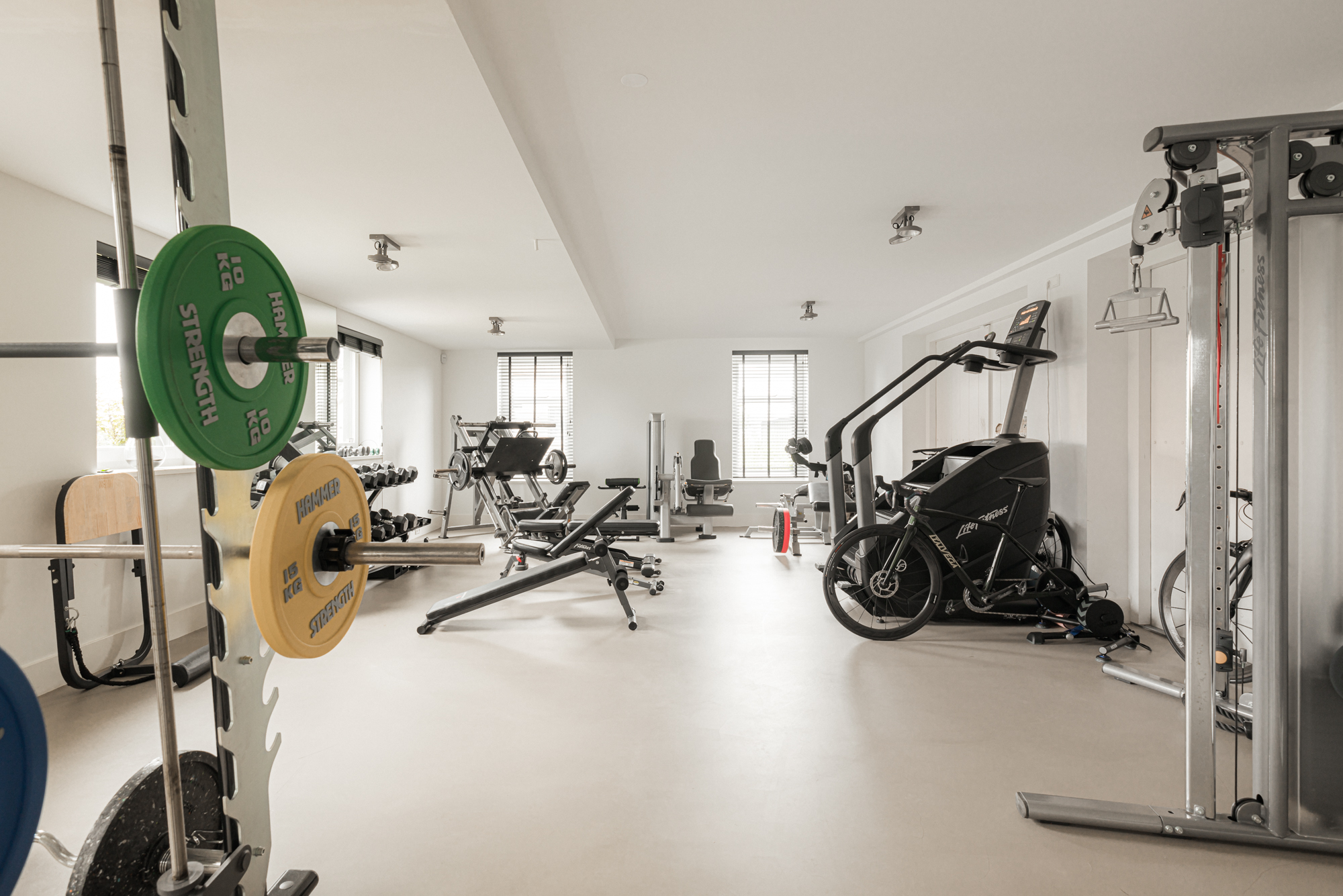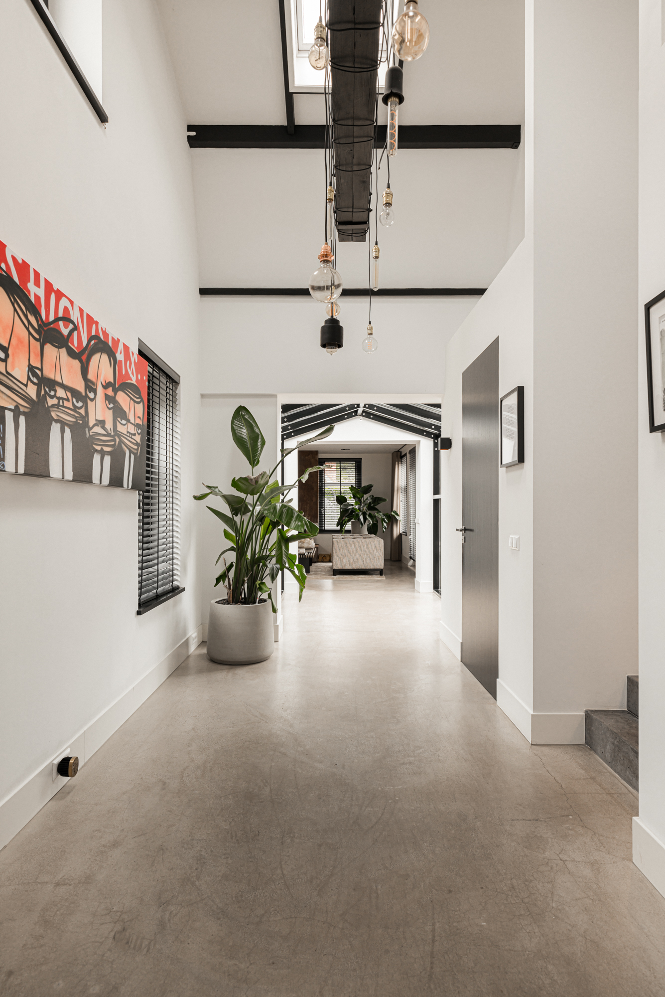 Via het glazen atrium wordt het hoofdgebouw verbonden met het achterhuis, alwaar een indoor gym met bar (voorheen inpandige garage voor 3 auto's). Op de eerste verdieping van het achterhuis tref je een zelfstandige woonstudio, voorzien van woonkamer, slaapkamer met badkamer en eigen keuken. Ideaal voor een au-pair of inwonend familielid.