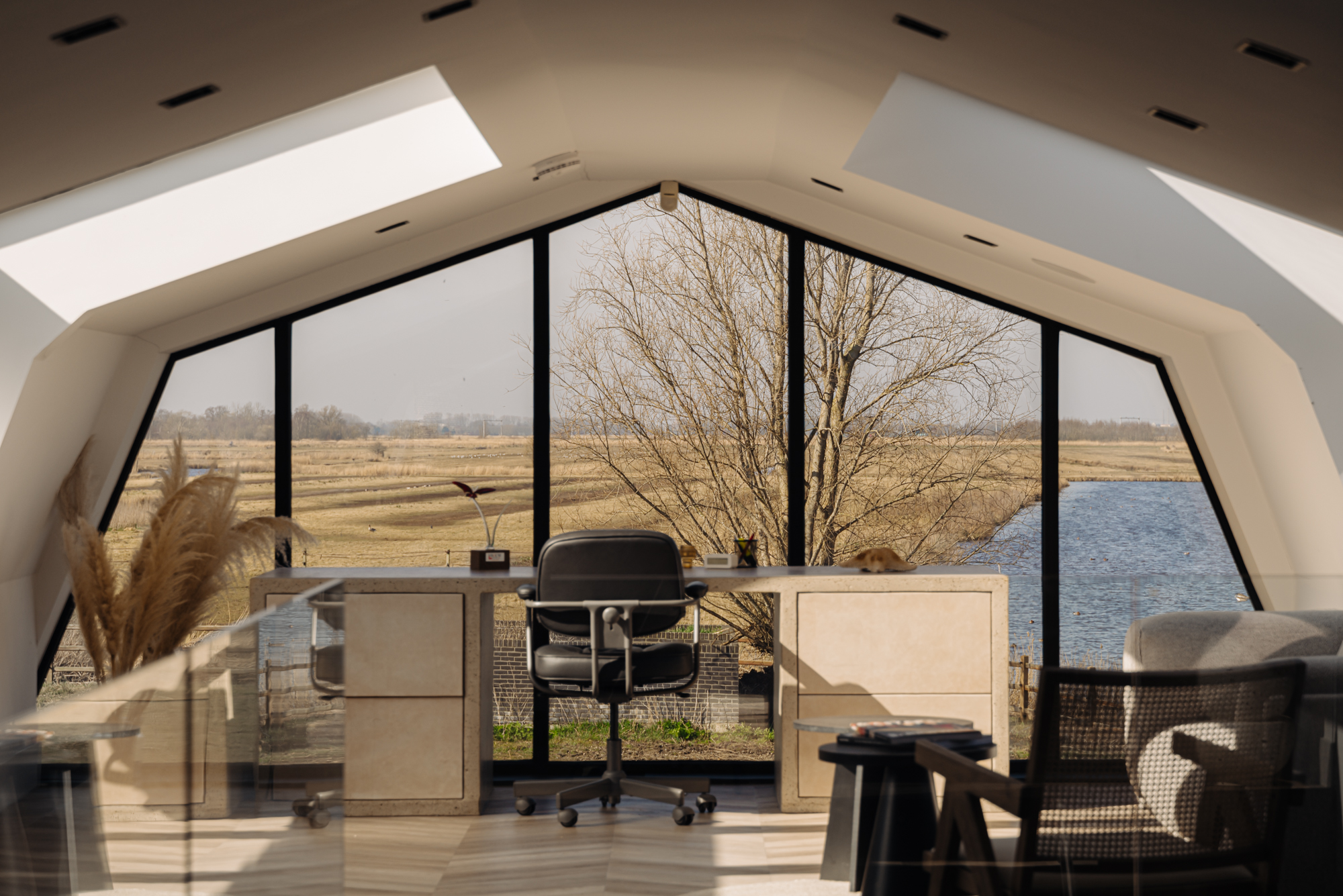 Het prachtige vrijstaande bijgebouw en/of gastenverblijf is een zeer multifunctionele ruimte met een adembenemend vrij uitzicht over water en weilanden. De centrale open vide met trapopgang, verbindt de 2 etages. De gebruiksmogelijkheden zijn eindeloos.