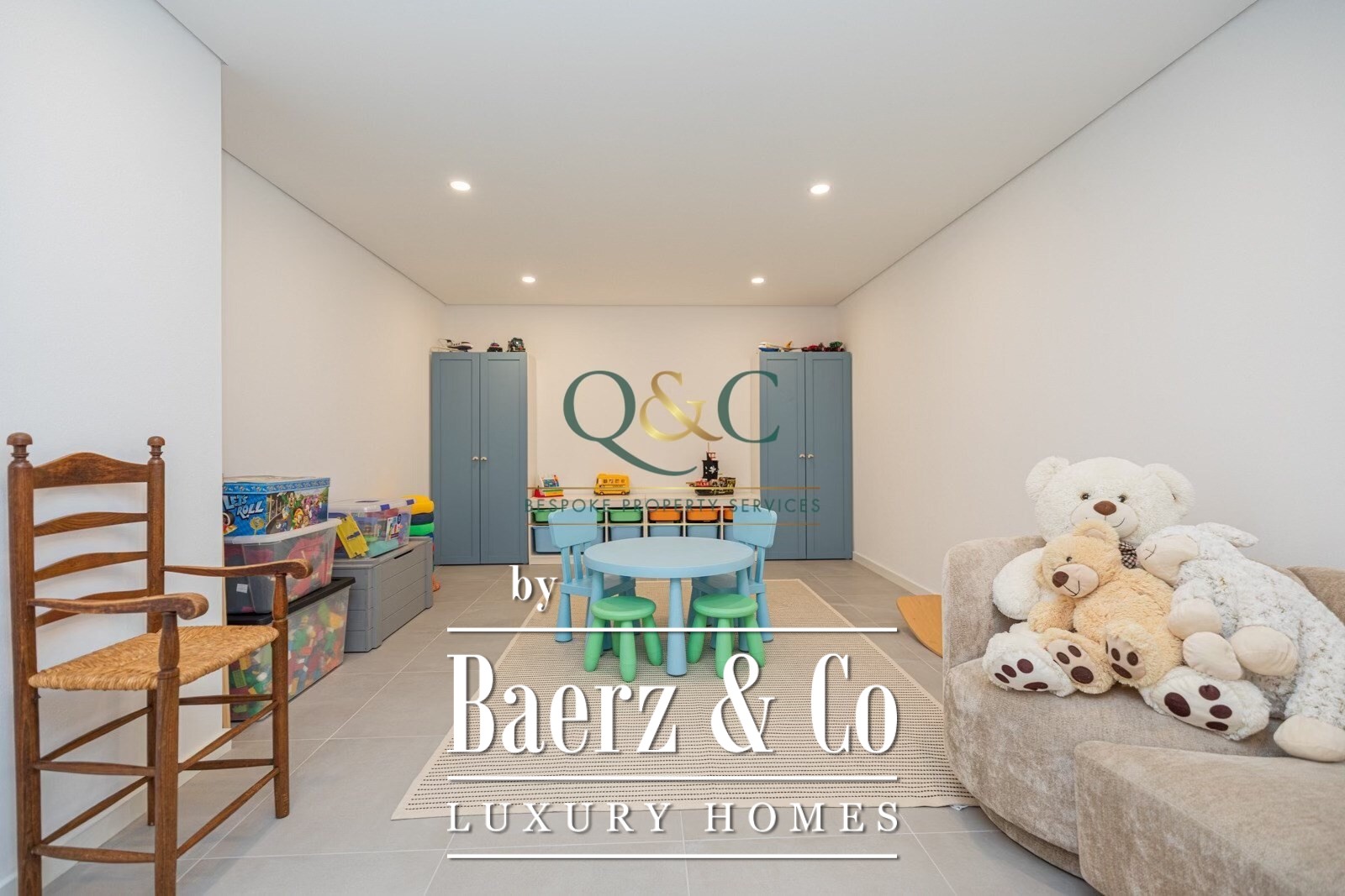 Op de bovenverdieping zijn drie extra slaapkamers, waaronder een met en-suite badkamer, aangevuld met een tweede badkamer. Een trap leidt naar het ruime dakterras, waar ontspannen onder de open hemel centraal staat. Het royale souterrain biedt een vijfde slaapkamer, een badkamer en een ruime family playroom, ideaal als toevluchtsoord of voor recreatie.
