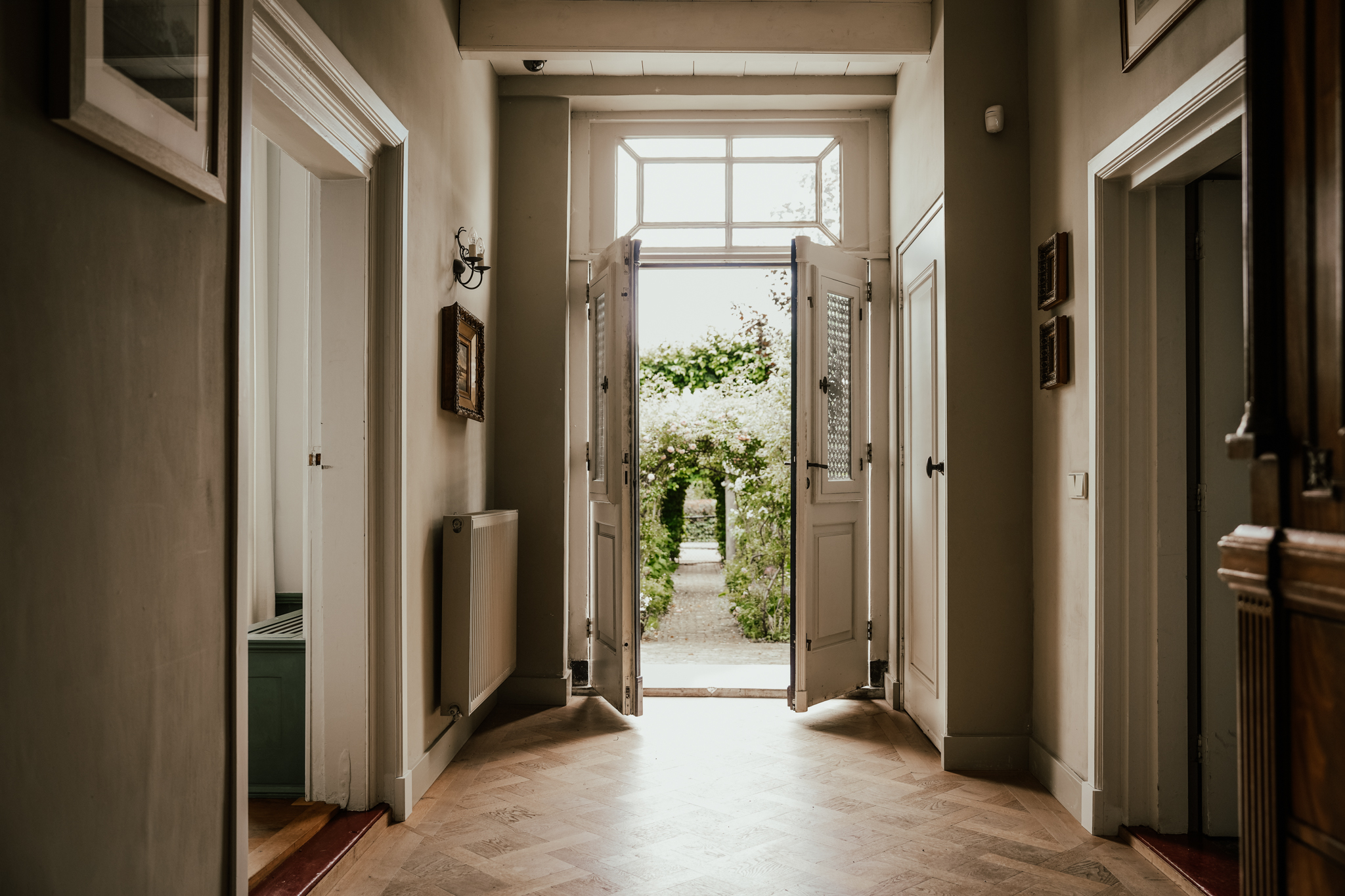 Ruime hal en achtergelegen gang met eiken Versaillesparket. Rechts van de hal ligt de studeerkamer met zicht op de Kerkstraat. Deze kamer heeft inbouwkasten en een brede schouw met houtkachel.
