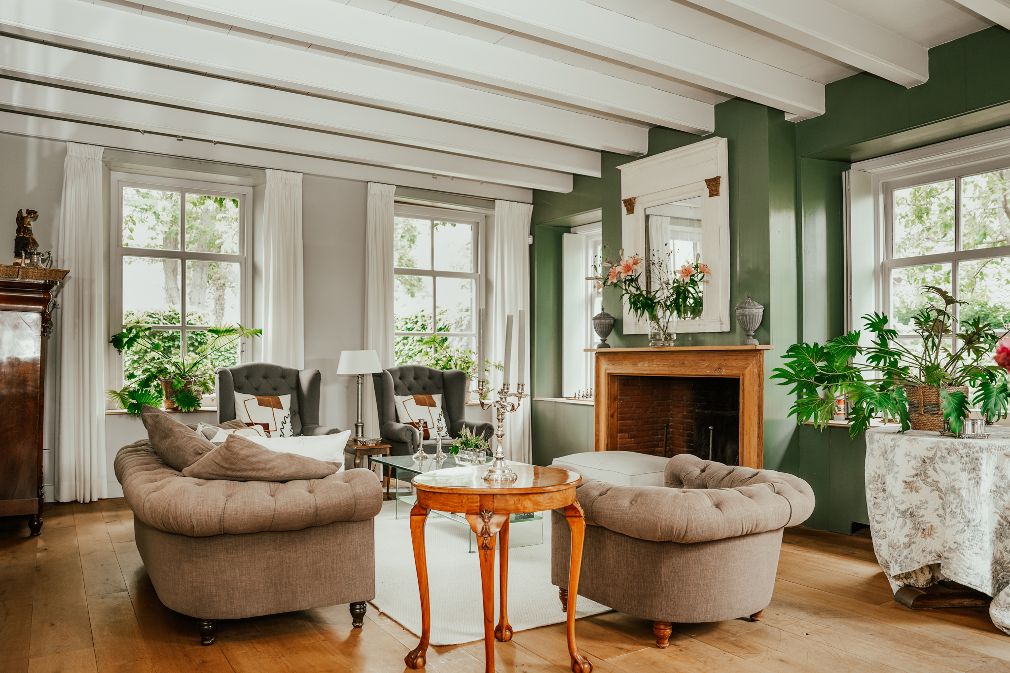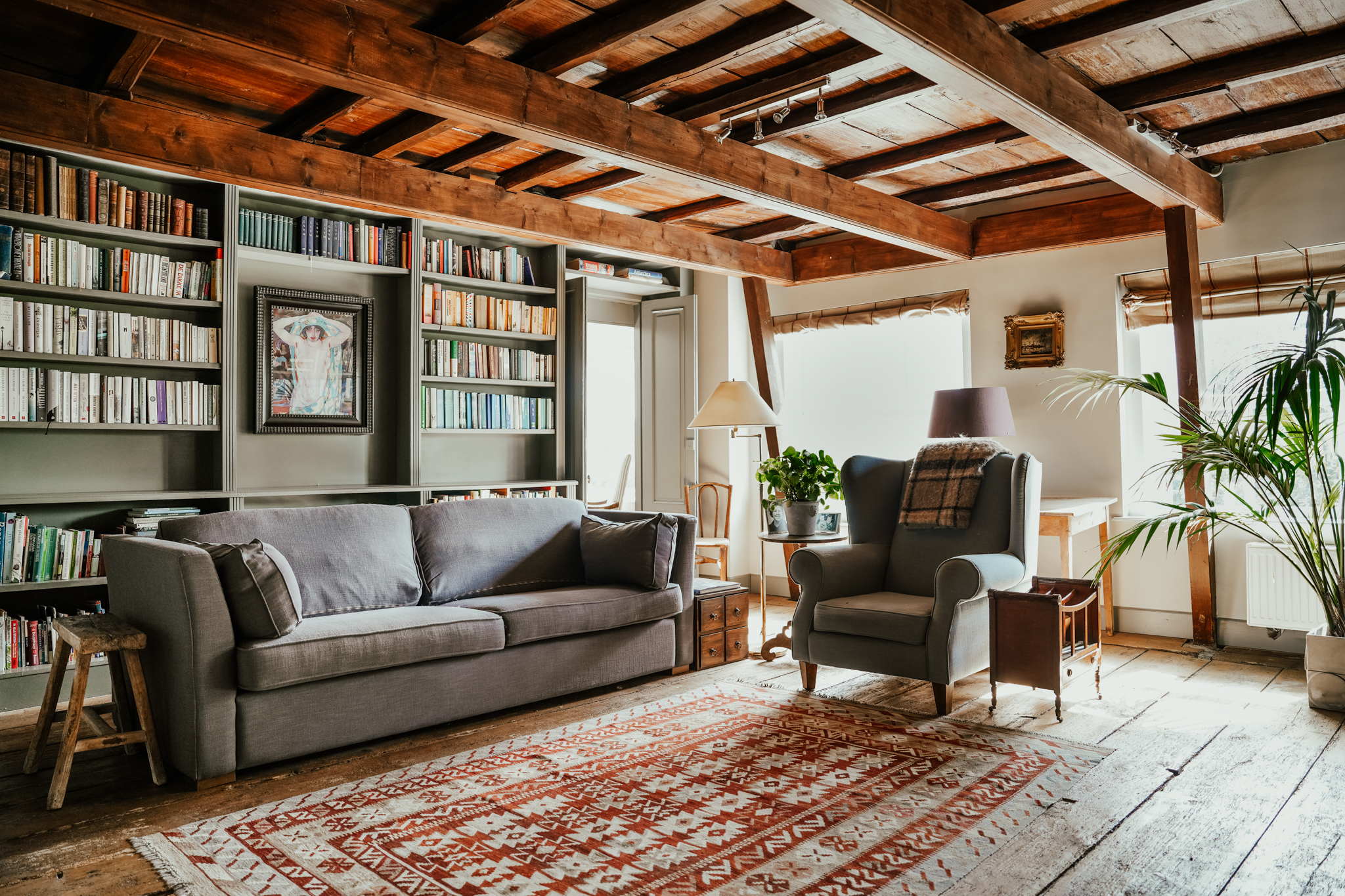 Aan de linkerzijde van de hal ligt de woonkamer. Door de hoge roederamen met binnenluiken en het witgeschilderde balkenplafond een heerlijke lichte ruimte. Er is een schouw met openhaard, brede eiken vloerdelen en een diepe vaste kast.