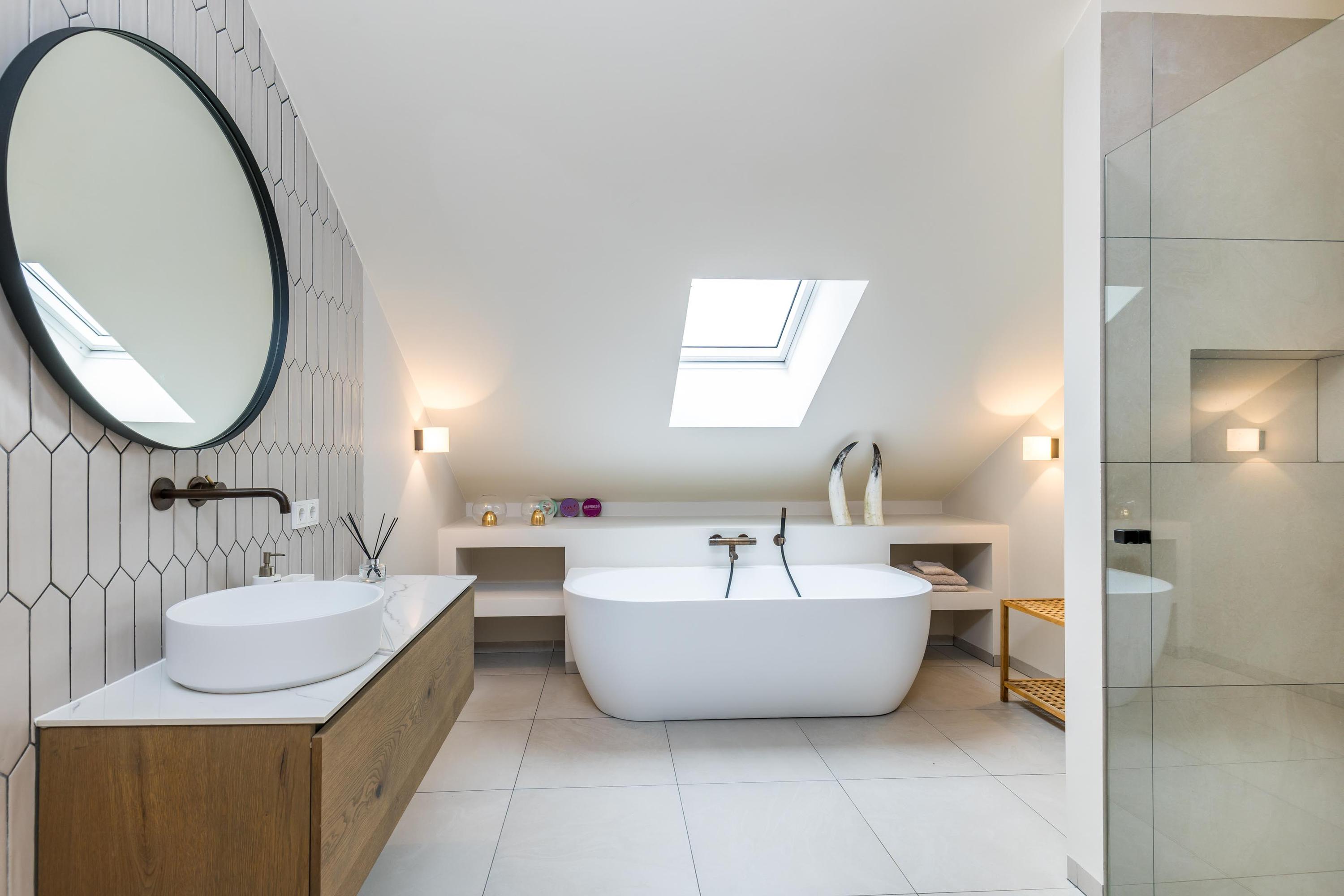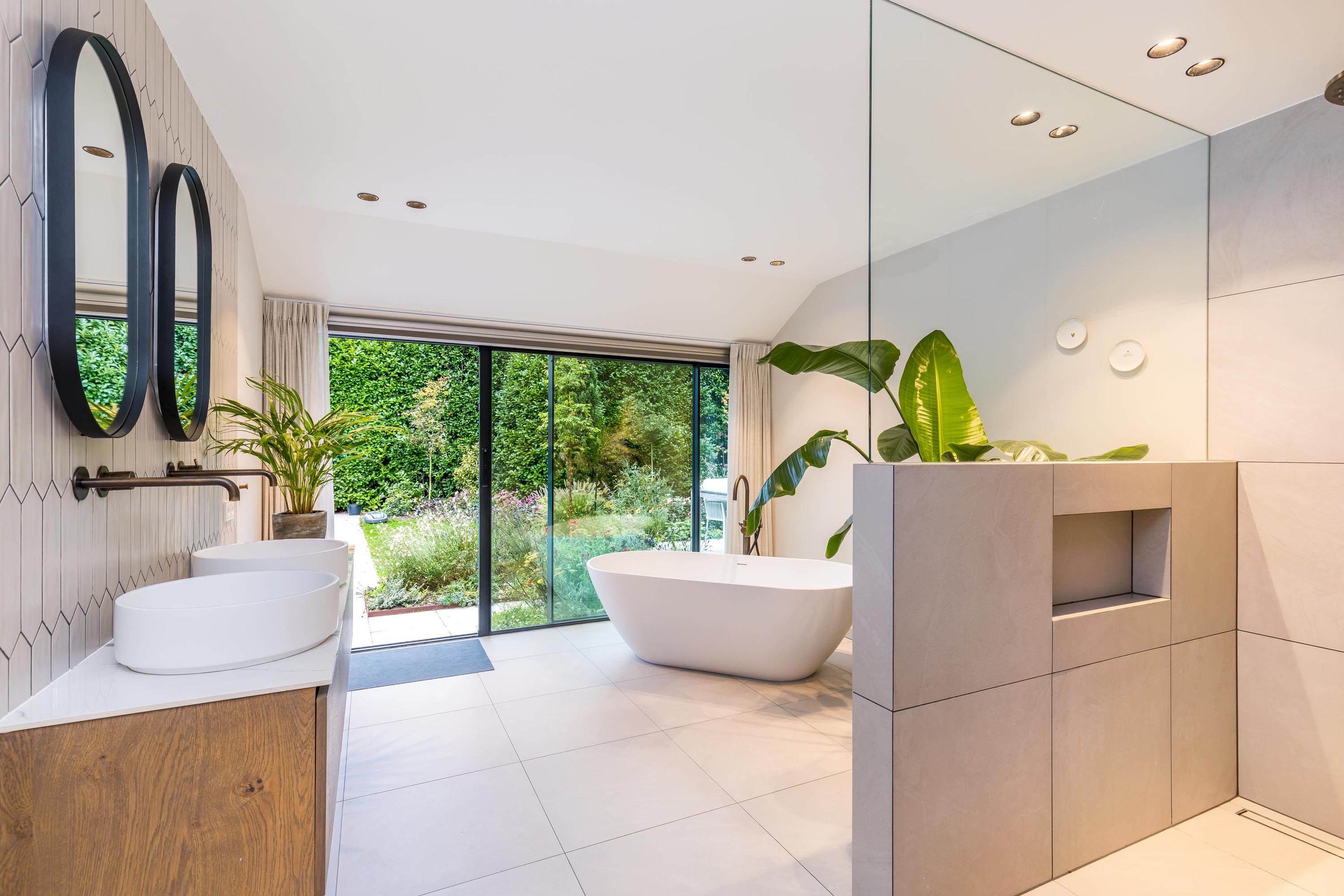 Charmante tuingerichte zitkamer met knusse open haard en leuke doorkijkjes naar zowel de voortuin als de achtertuin met beekje. Vanuit de woonkeuken is er toegang tot een ruimte tv-kamer aan de voorzijde. Eveneens vanuit de keuken is er een aparte gang met toilet voorzien van fonteintje en toegang tot de master bedroom met walk-in closet en eigen luxe badkamer met uitzicht op de tuin en voorzien van een vrijstaand ligbad, inloopdouche en wastafelmeubel. Voorts is er een ruime waskamer/mud room met veel bergruimte waar ook bijvoorbeeld een fitnesskamer van de maken is. In deze ruimte is de opstelling van de installaties, waaronder de warmtepomp, mooi weggewerkt.