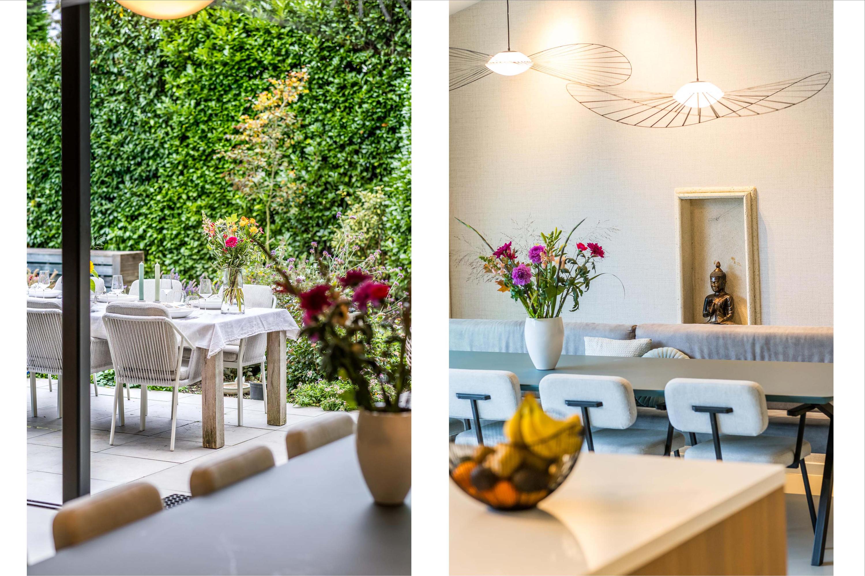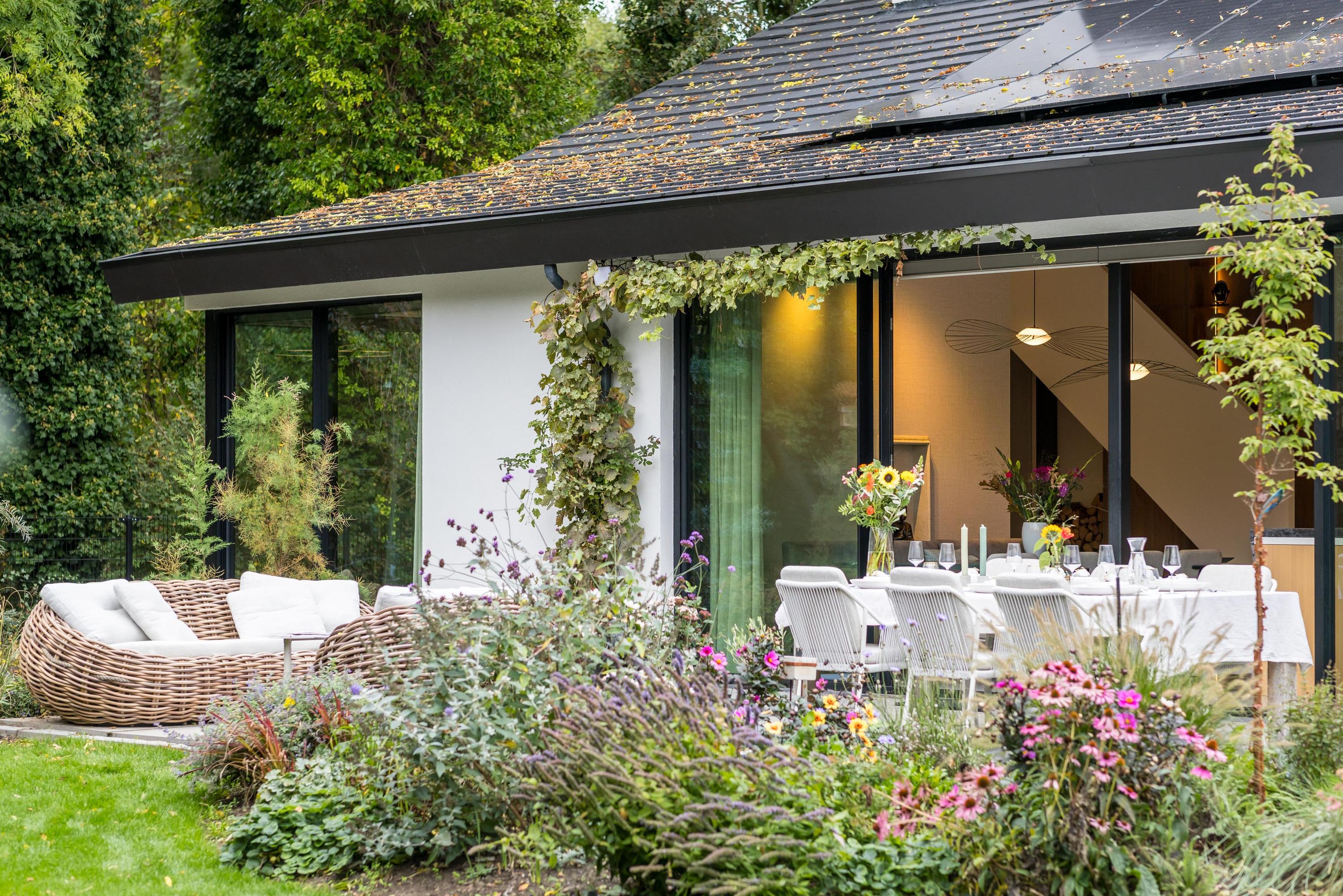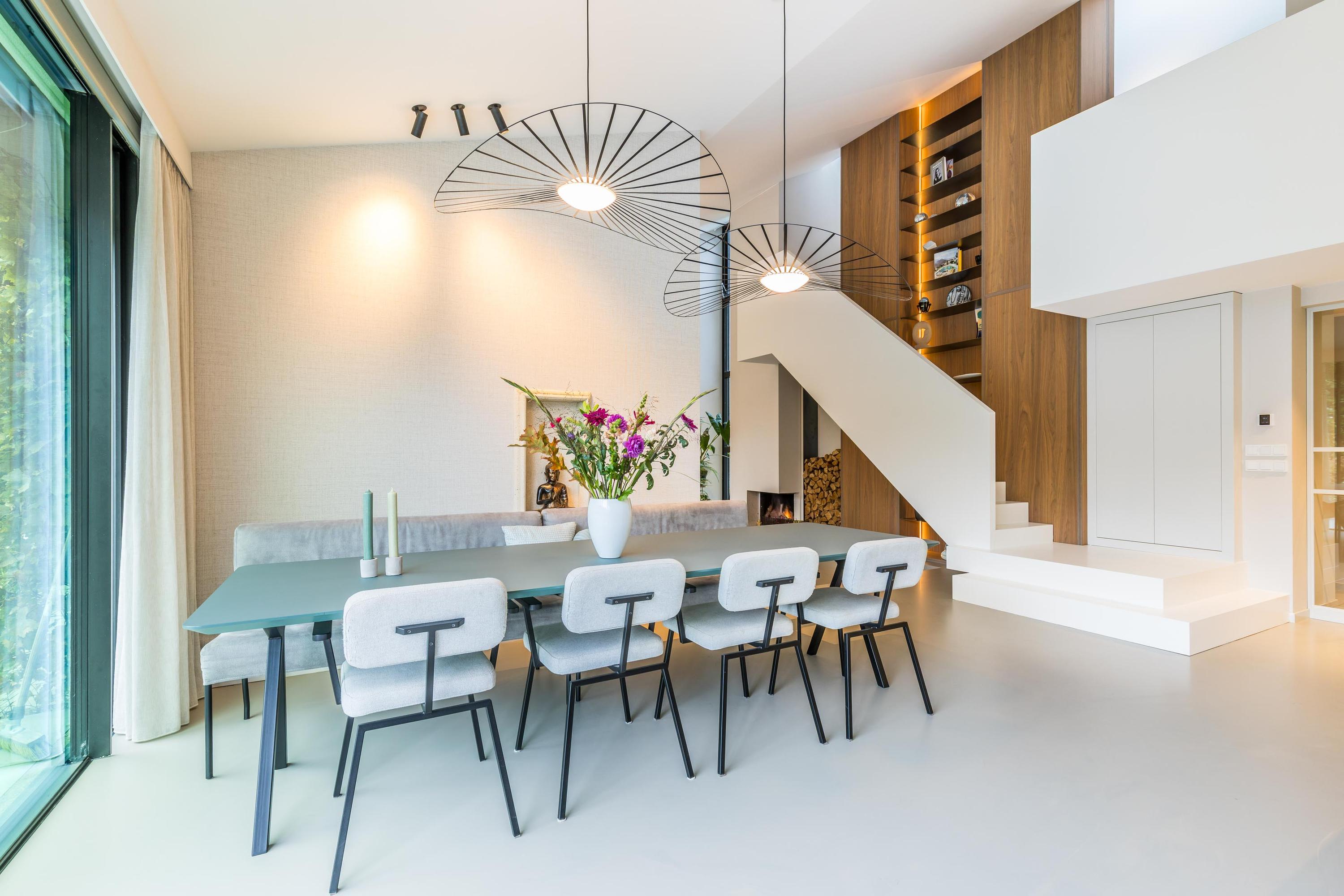In het verlengde van de entreehal is er toegang tot de tuingerichte woonkeuken met een spectaculaire hoogte, een prachtige strakke keuken met kookeiland en voorzien van alle wenselijke inbouwapparatuur. Schuifpuien geven toegang tot het onderheide terras en de aantrekkelijke achtertuin.