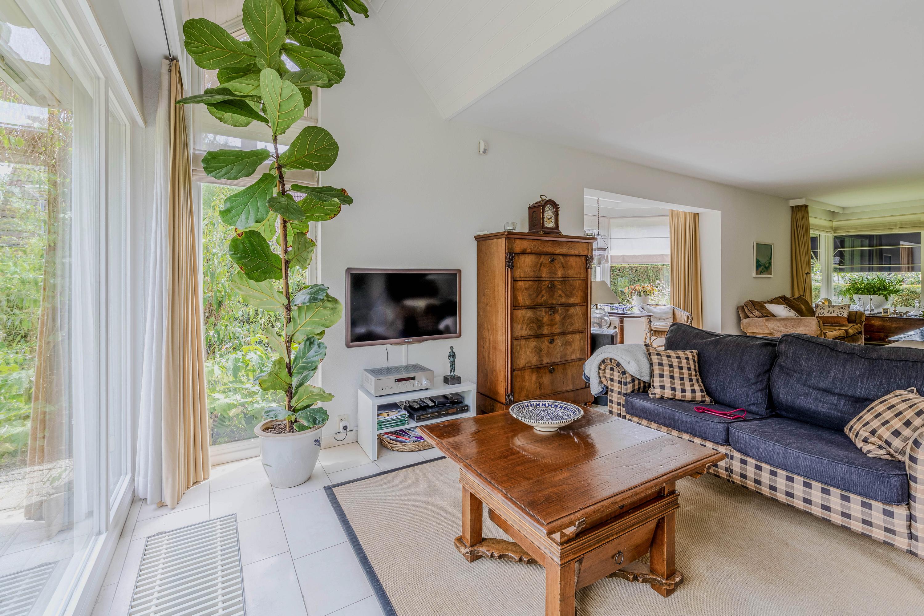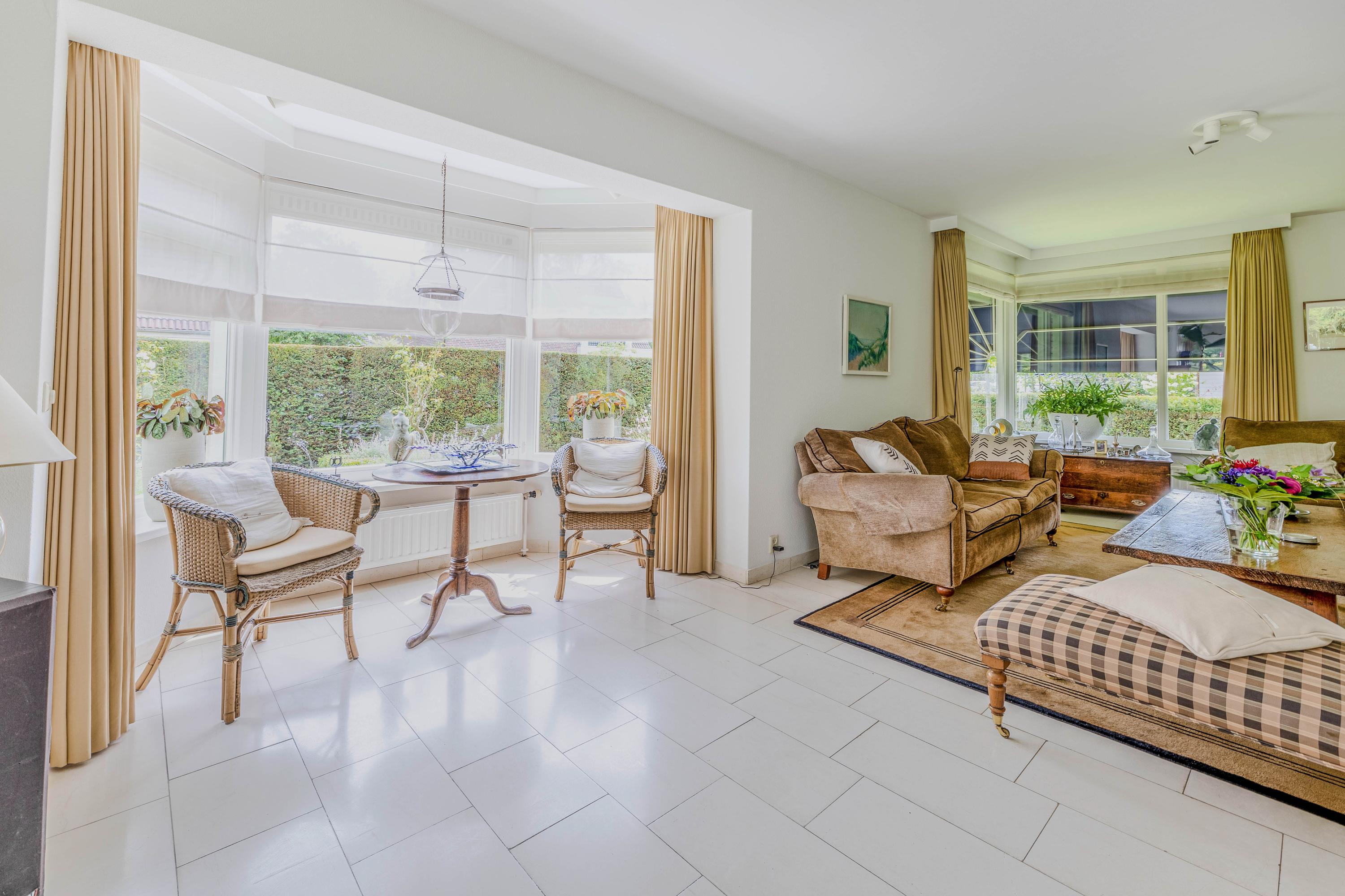 U kunt genieten van een ruime en lichte woonkamer van 62m² met een prachtig uitzicht op de mooi aangelegde tuin. De woonkamer is voorzien van een erker en een tv-hoek waar de fraaie architectuur mede door het dakvenster tot uitdrukking komt. Daarnaast is er een open haard aanwezig.