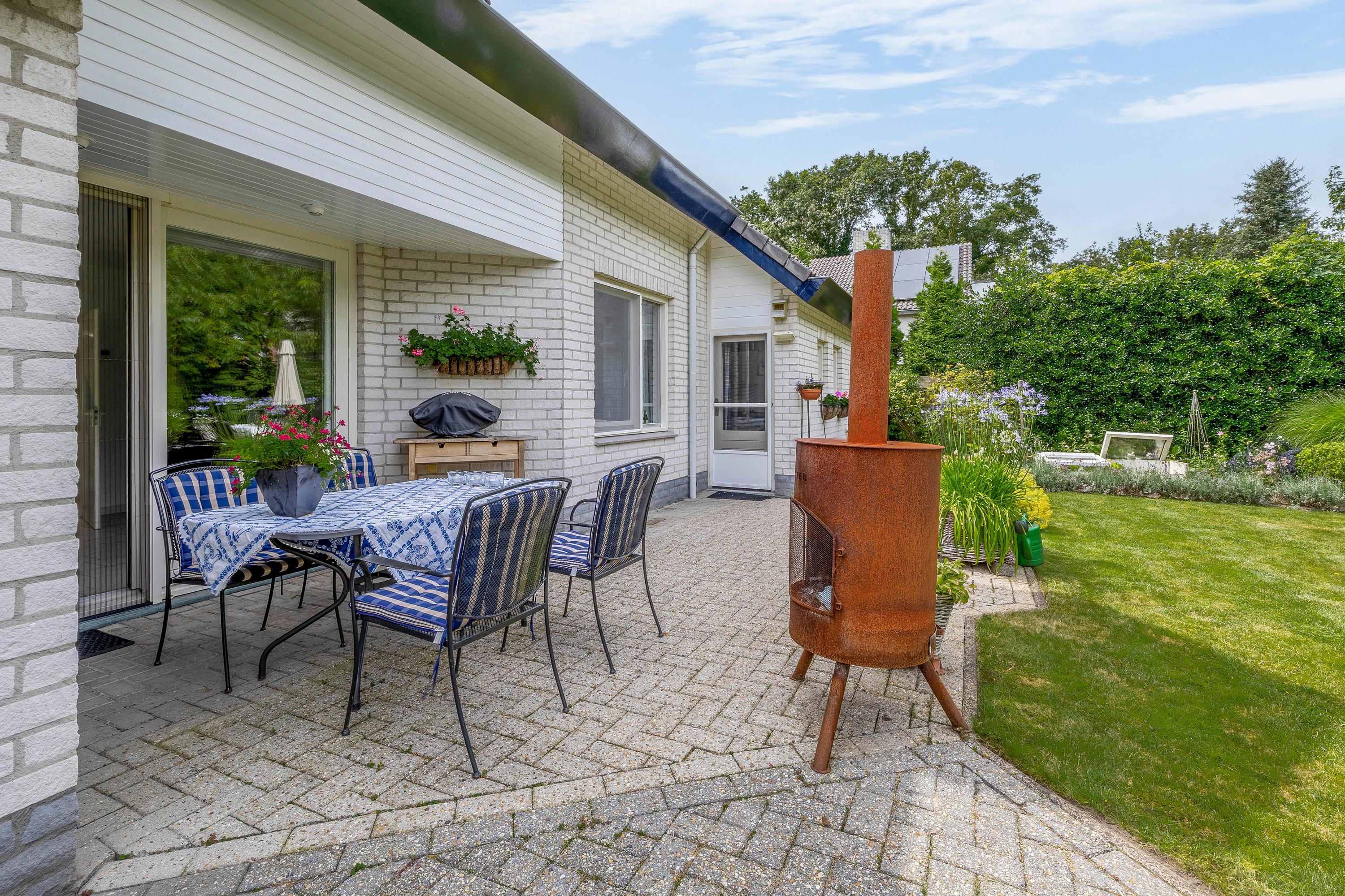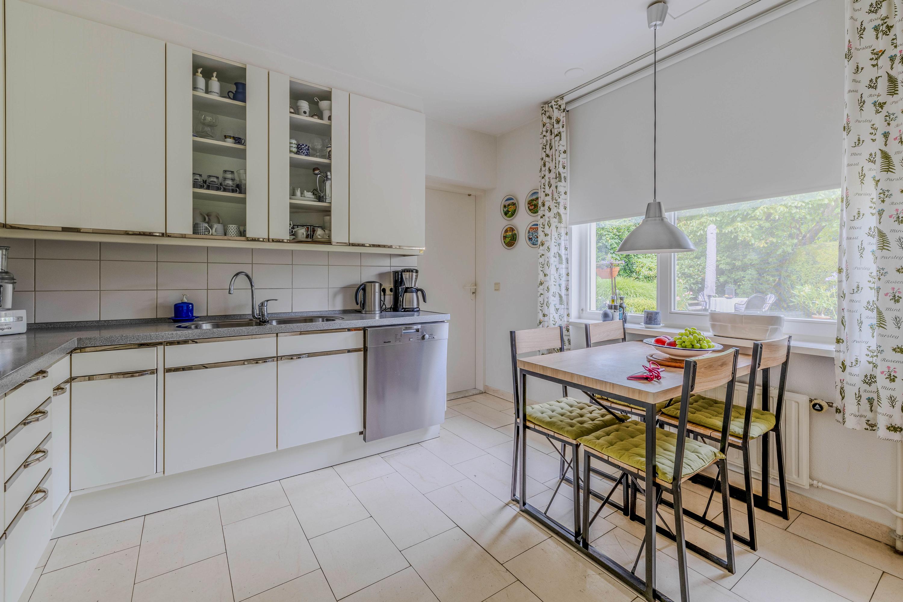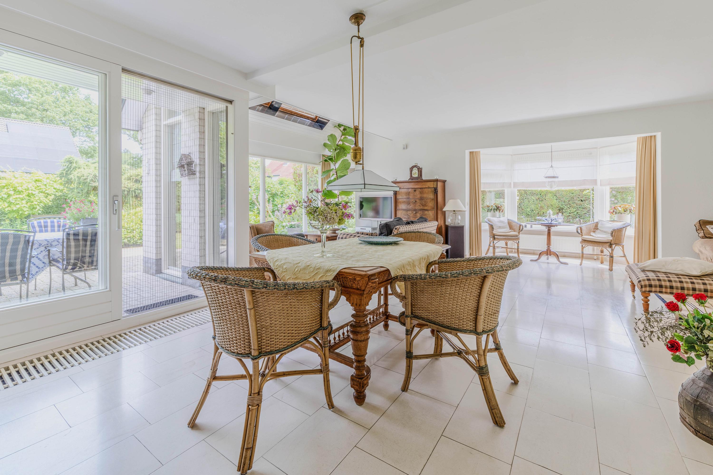 Vanuit de woonkamer loopt u via een schuifpui naar het royale- en deels overdekte terras en tuin. De ramen zijn voorzien van automatische zonwering.