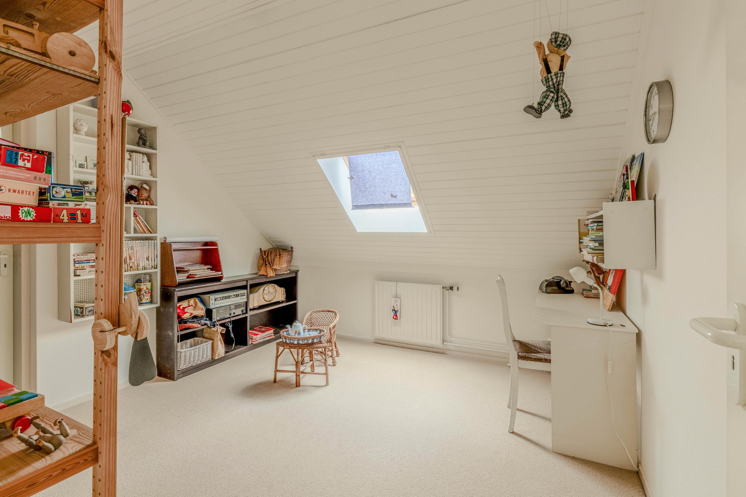 Grote bergzolder met meerdere ruimtes bereikbaar vanuit de overloop van de 1ste verdieping door middel van een vlizotrap.