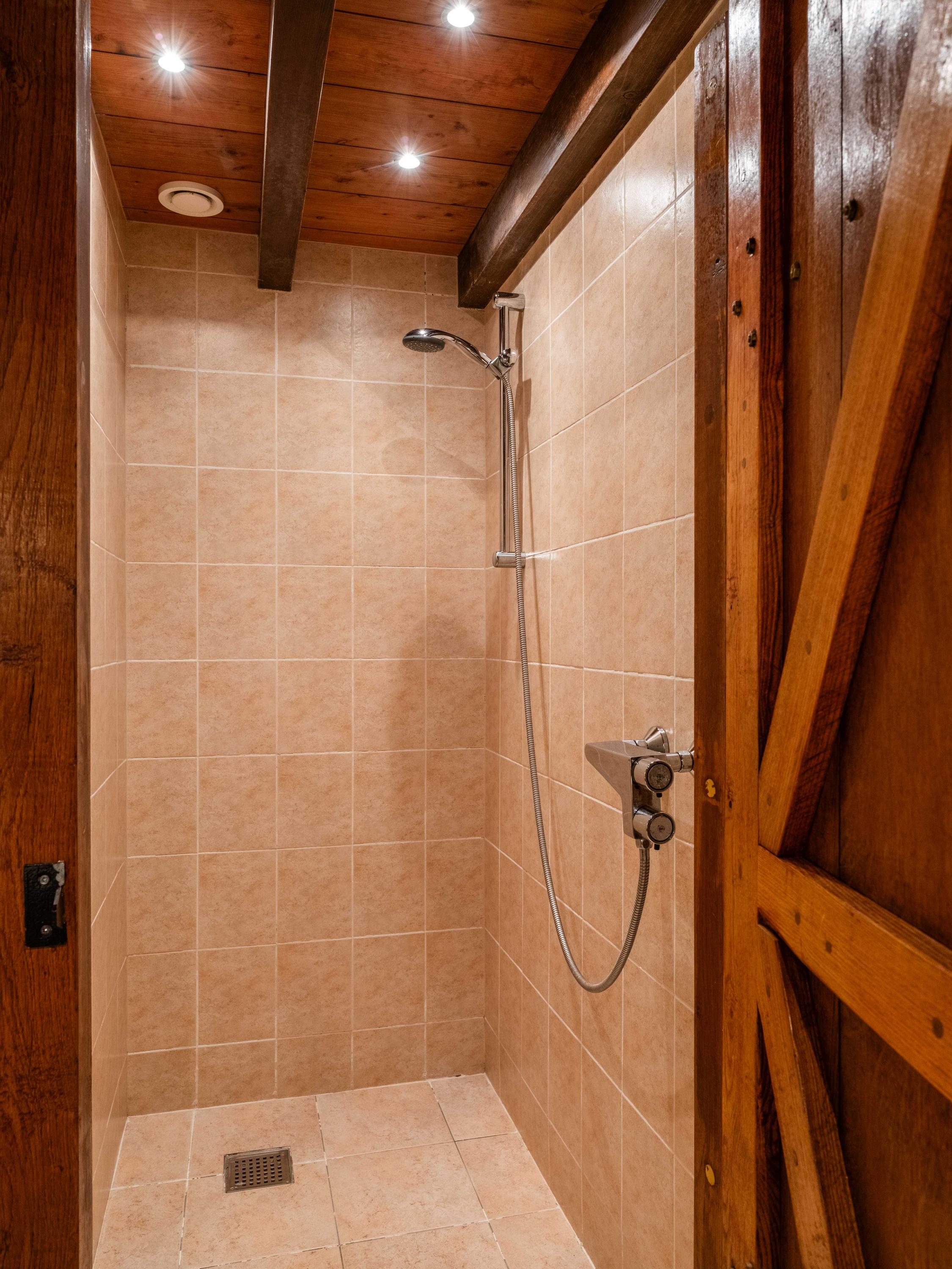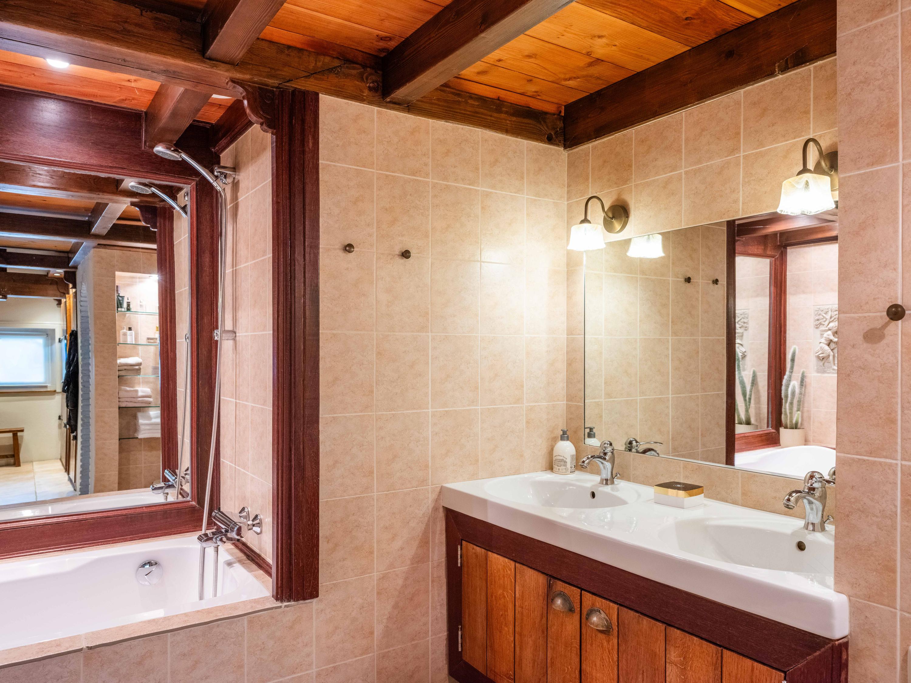 Aangrenzend aan de keuken bevindt zich de luxe badkamer, uitgerust met een ligbad, inloopdouche, toilet, dubbele wastafel. Tegenover de badkamer is een ruimte gelegen met kastruimte voor leg- en hangkleding. Daarnaast loopt de keuken aan de andere zeide over in de sfeervolle zitkamer, waar het vele licht en het uitzicht op het water direct opvallen. Deze ruimte is ruim en erg gezellig, mede door de houtkachel die voor warmte en sfeer zorgt.