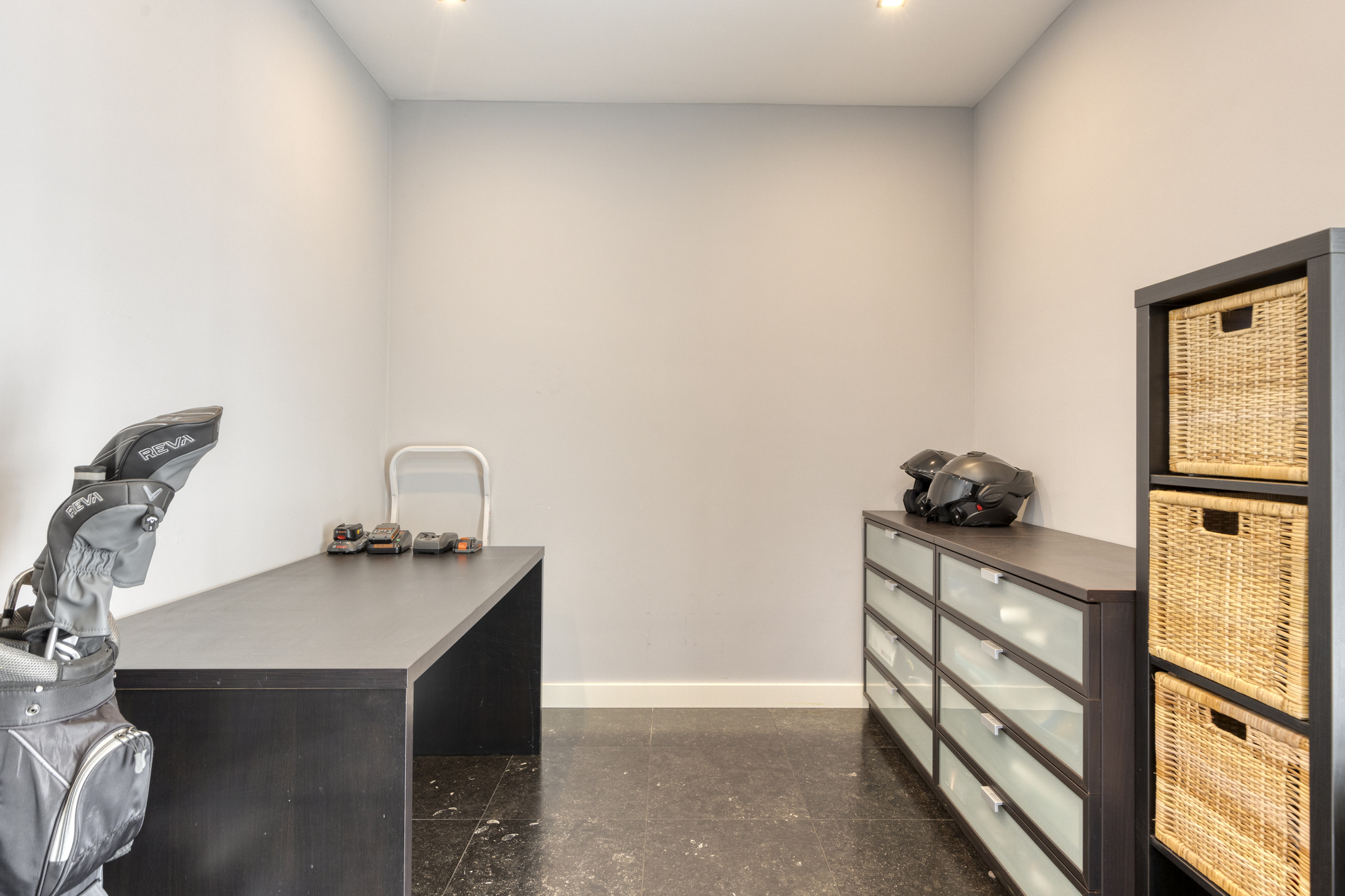Werk-/speelkamer: wanden gestuct, natuurstenen vloer, plafond gestuct.